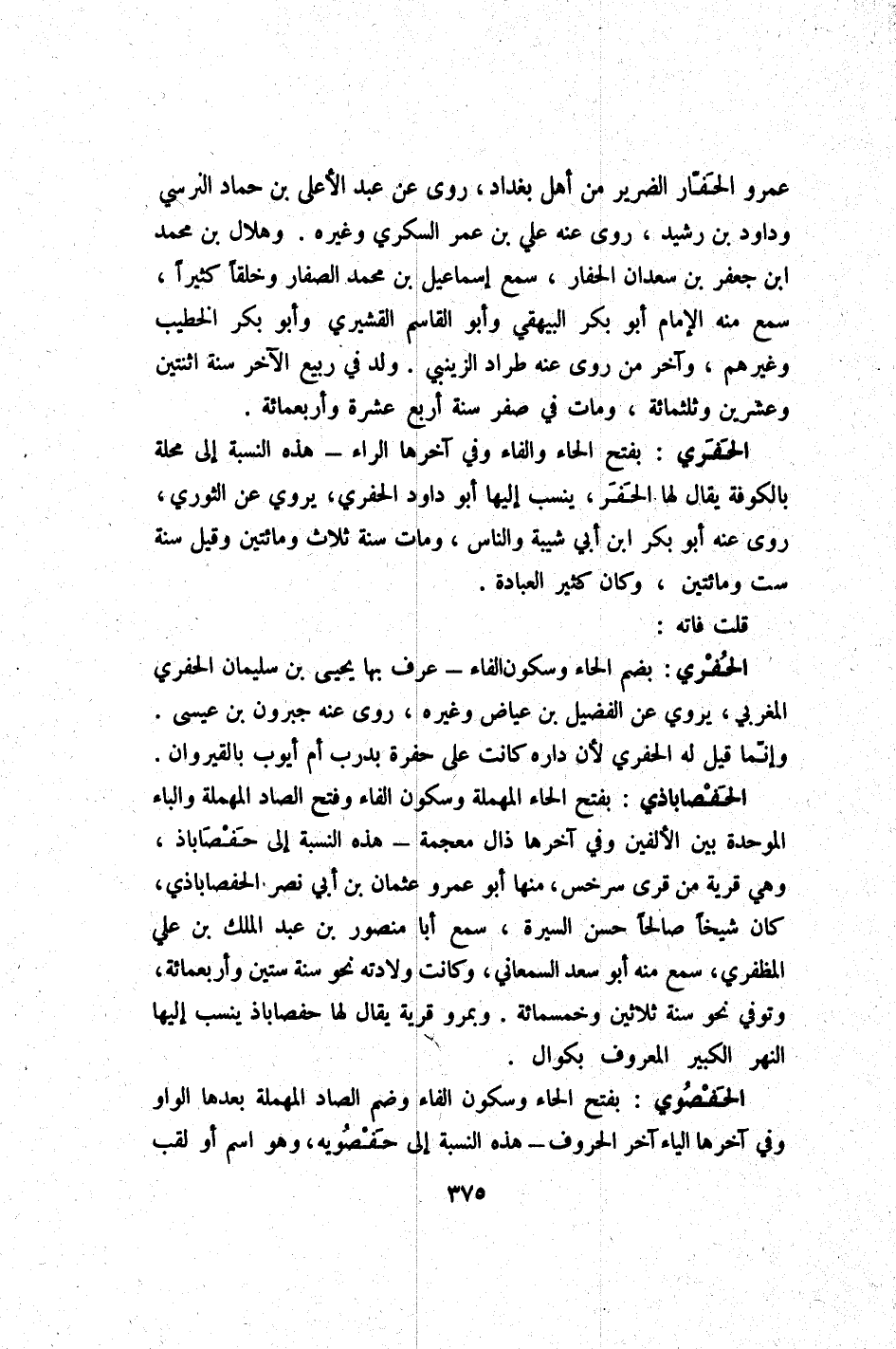 الْحَفرِي بِفَتْح الْحَاء وَالْفَاء وَفِي آخرهَا الرَّاء - هَذِه النِّسْبَة إِلَى محلّة بِالْكُوفَةِ يُقَال لَهَا الْحفر ينْسب إِلَيْهَا أَبُو دَاوُد الْحَفرِي يروي عَن الثَّوْريّ روى عَنهُ أَبُو بكر ابْن أبي شيبَة وَالنَّاس وَمَات سنة ثَلَاث وَمِائَتَيْنِ وَقيل سنة سِتّ وَمِائَتَيْنِ وَكَانَ كثير الْعِبَادَة