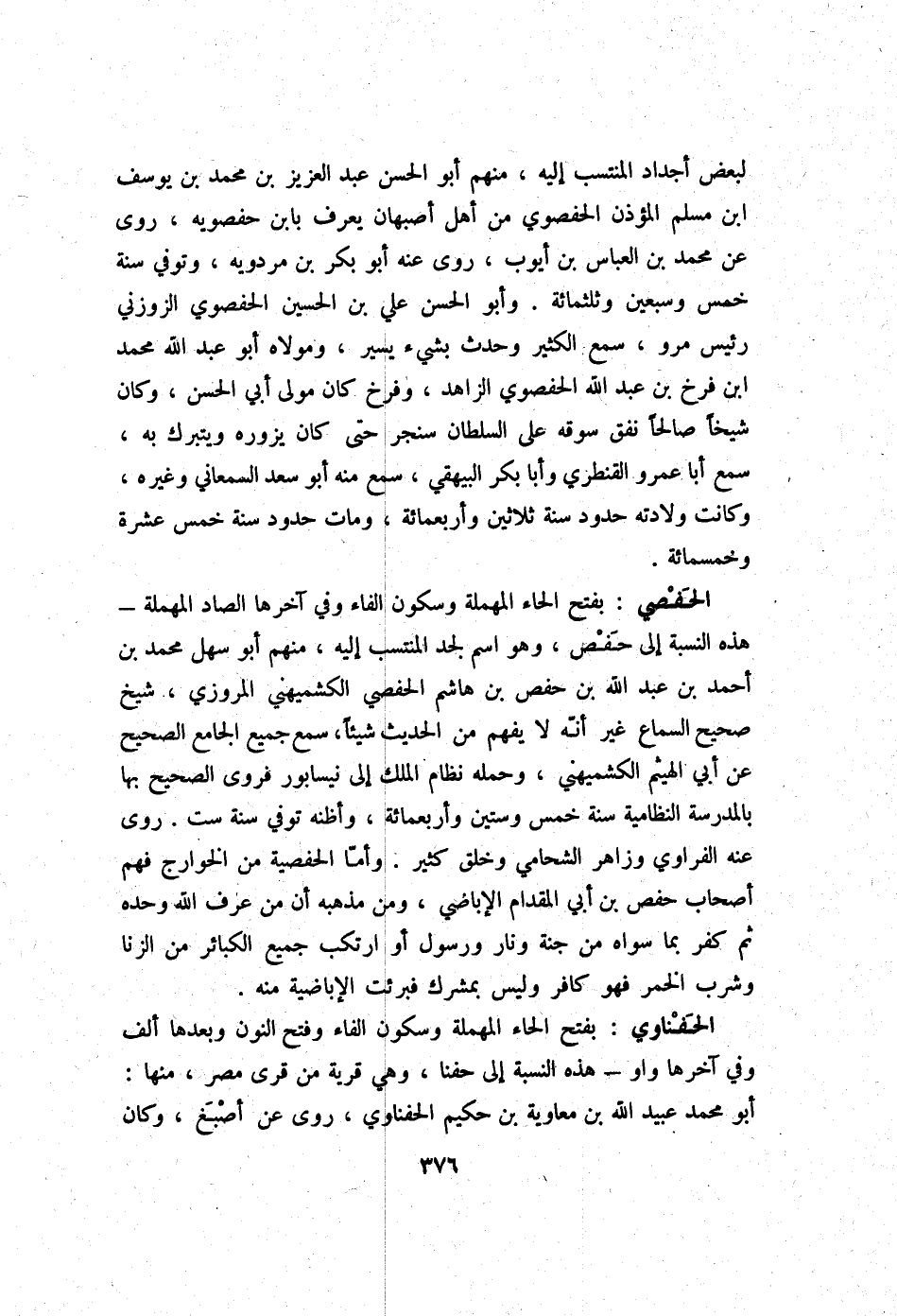 الحفصي بِفَتْح الْحَاء الْمُهْملَة وَسُكُون الْفَاء وَفِي آخرهَا الصَّاد الْمُهْملَة - هَذِه النِّسْبَة إِلَى حَفْص وَهُوَ اسْم لجد المنتسب إِلَيْهِ مِنْهُم أَبُو سهل مُحَمَّد بن أَحْمد بن عبد الله بن حَفْص بن هَاشم الحفصي الْكشميهني الْمروزِي شيخ صَحِيح السماع غير أَنه لَا يفهم من الحَدِيث شَيْئا سمع جَمِيع الْجَامِع الصَّحِيح عَن أبي الْهَيْثَم الْكشميهني وَحمله نظام الْملك إِلَى نيسابور فروى الصَّحِيح بهَا بِالْمَدْرَسَةِ النظامية سنة خمس وَسِتِّينَ وَأَرْبَعمِائَة وَأَظنهُ توفّي سنة سِتّ روى عَنهُ الفراوي وزاهر الشحامي وَخلق كثير وَأما الحفصية من الْخَوَارِج فهم أَصْحَاب حَفْص بن أبي الْمِقْدَام الإباضي وَمن مذْهبه أَن من عرف الله وَحده ثمَّ كفر بِمَا سواهُ من جنَّة ونار وَرَسُول أَو ارْتكب جَمِيع الْكَبَائِر من الزِّنَا وَشرب الْخمر فَهُوَ كَافِر وَلَيْسَ بمشرك فبرئت الإباضية مِنْهُ