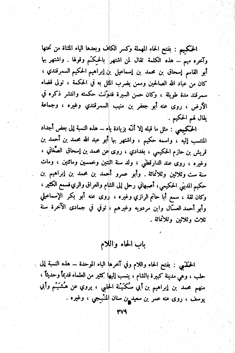 الْحَكِيم بِفَتْح الْحَاء الْمُهْملَة وَكسر الْكَاف وَبعدهَا الْيَاء الْمُثَنَّاة من تحتهَا وَآخره مِيم - هَذِه الْكَلِمَة تقال لمن اشْتهر بالحكم وَقَوْلها واشتهر بهَا أَبُو الْقَاسِم إِسْحَاق بن مُحَمَّد بن إِسْمَاعِيل بن إِبْرَاهِيم الْحَكِيم السَّمرقَنْدِي كَانَ من عباد الله الصَّالِحين وَمِمَّنْ يضْرب الْمثل بِهِ فِي الْحِكْمَة تولى قَضَاء سَمَرْقَنْد مُدَّة طَوِيلَة وَكَانَ حسن السِّيرَة فدونت حكمته وانتشر ذكره فِي الأَرْض روى عَنهُ أَبُو جَعْفَر بن منيب السَّمرقَنْدِي وَغَيره وَجَمَاعَة يُقَال لَهُم الْحَكِيم