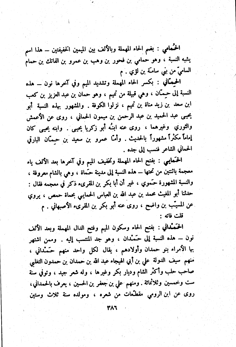 الحمداني بِفَتْح الْحَاء وَسُكُون الْمِيم وَفتح الدَّال الْمُهْملَة وَبعد الْألف نون - هَذِه النِّسْبَة إِلَى حمدَان وَهُوَ جد المنتسب إِلَيْهِ وَمِمَّنْ اشْتهر بهَا الْأُمَرَاء بَنو حمدَان وَأَوْلَادهمْ يُقَال لكل وَاحِد مِنْهُم حمداني مِنْهُم سيف الدولة عَليّ بن أبي الهيجاء عبد الله بن حمدَان بن حمدون التغلبي صَاحب حلب وَأكْثر الشَّام وديار بكر وَغَيرهَا وَله شعر جيد وَتُوفِّي سنة سِتّ وَخمسين وثلاثمائة وَمِنْهُم عَليّ بن جَعْفَر بن الْحُسَيْن يعرف بالحمداني روى عَن ابْن الرُّومِي مقطعات من شعره ومولده سنة ثَلَاث وَسِتِّينَ