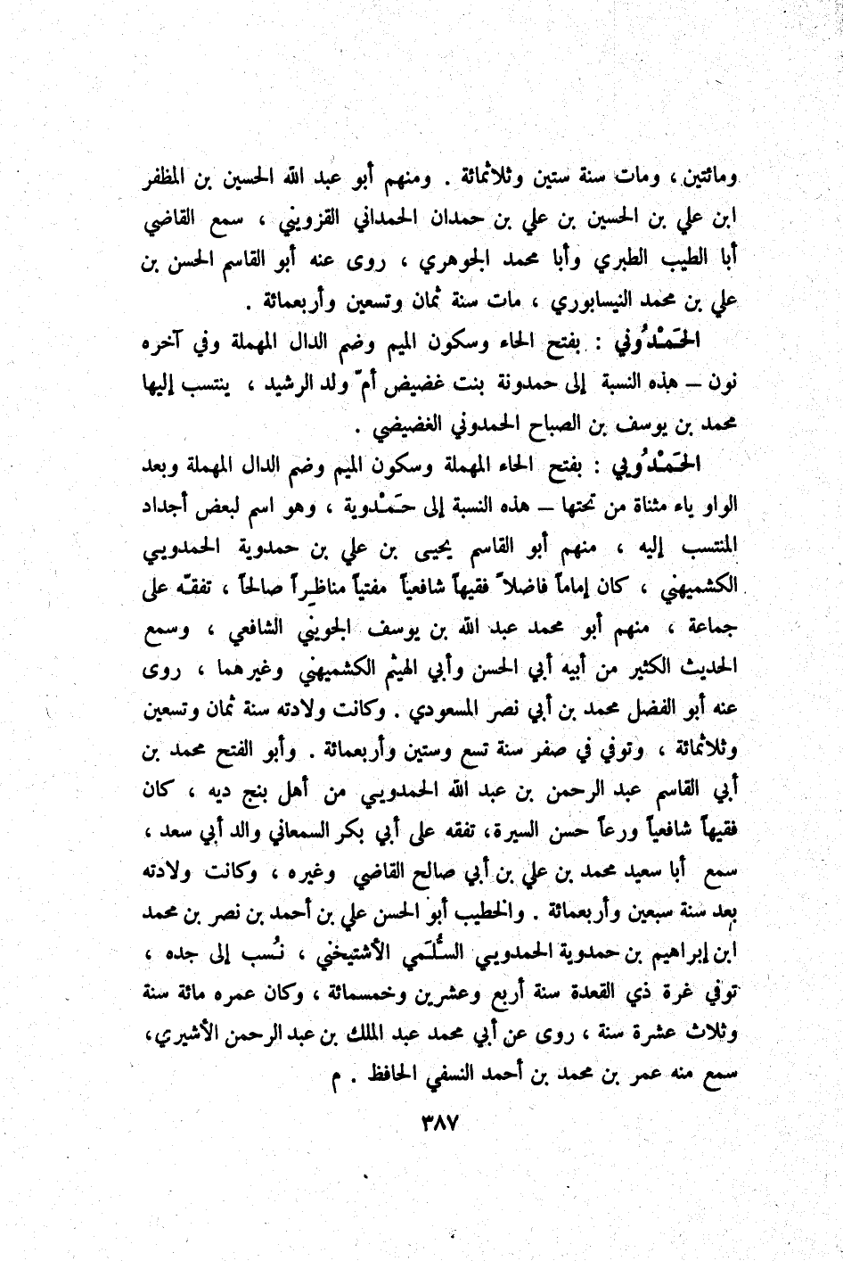الحمدويي بِفَتْح الْحَاء الْمُهْملَة وَسُكُون الْمِيم وَضم الدَّال الْمُهْملَة وَبعد الْوَاو يَاء مثناة من تحتهَا - هَذِه النِّسْبَة إِلَى حمدوية وَهُوَ اسْم لبَعض أجداد المنتسب إِلَيْهِ مِنْهُم أَبُو الْقَاسِم يحيى بن عَليّ بن حمدوية الحمدويي الْكشميهني كَانَ إِمَامًا فَاضلا فَقِيها شافعيا مفتيا مناظرا صَالحا تفقه على جمَاعَة مِنْهُم أَبُو مُحَمَّد عبد الله بن يُوسُف الْجُوَيْنِيّ الشَّافِعِي وَسمع الحَدِيث الْكثير من أَبِيه أبي الْحسن وَأبي الْهَيْثَم الْكشميهني وَغَيرهمَا روى عَنهُ أَبُو الْفضل مُحَمَّد بن أبي نصر المَسْعُودِيّ وَكَانَت وِلَادَته سنة ثَمَان وَتِسْعين وثلاثمائة وَتُوفِّي فِي صفر سنة تسع وَسِتِّينَ وَأَرْبَعمِائَة وابو الْفَتْح مُحَمَّد بن أبي الْقَاسِم عبد الرَّحْمَن بن عبد الله الحمدويي من أهل بنج ديه كَانَ فَقِيها شافعيا ورعا حسن السِّيرَة تفقه على أبي بكر السَّمْعَانِيّ وَالِد أبي سعد سمع أَبَا سعيد مُحَمَّد بن عَليّ بن أبي صَالح القَاضِي وَغَيره وَكَانَت وِلَادَته بعد سنة سبعين وَأَرْبَعمِائَة والخطيب أَبُو الْحسن عَليّ بن أَحْمد بن نصر بن مُحَمَّد ابْن إِبْرَاهِيم بن حمدوية الحمدويي السّلمِيّ الأشتيخني نسب إِلَى جده توفّي غرَّة ذِي الْقعدَة سنة أَربع وَعشْرين وَخَمْسمِائة وَكَانَ عمره مائَة سنة وَثَلَاث عشرَة سنة روى عَن أبي مُحَمَّد عبد الْملك بن عبد الرَّحْمَن الأشيري سمع مِنْهُ عمر بن مُحَمَّد بن أَحْمد النَّسَفِيّ الْحَافِظ م