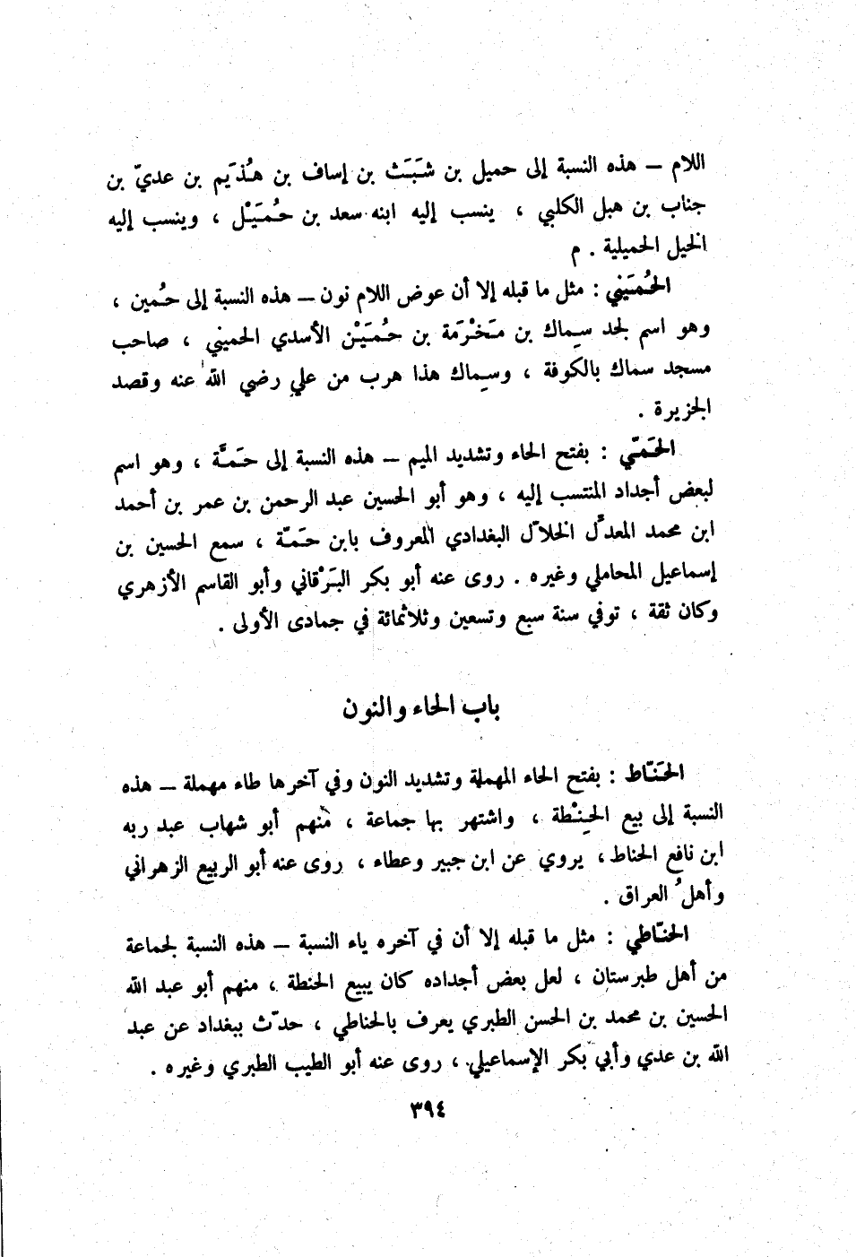 الحناطي مثل مَا قبله إِلَّا أَن فِي آخِره يَاء النِّسْبَة - هَذِه النِّسْبَة لجَماعَة من أهل طبرستان لَعَلَّ بعض أجداده كَانَ يَبِيع الْحِنْطَة مِنْهُم أَبُو عبد الله الْحُسَيْن بن مُحَمَّد بن الْحسن الطَّبَرِيّ يعرف بالحناطي حدث بِبَغْدَاد عَن عبد الله بن عدي وَأبي بكر الْإِسْمَاعِيلِيّ روى عَنهُ أَبُو الطّيب الطَّبَرِيّ وَغَيره