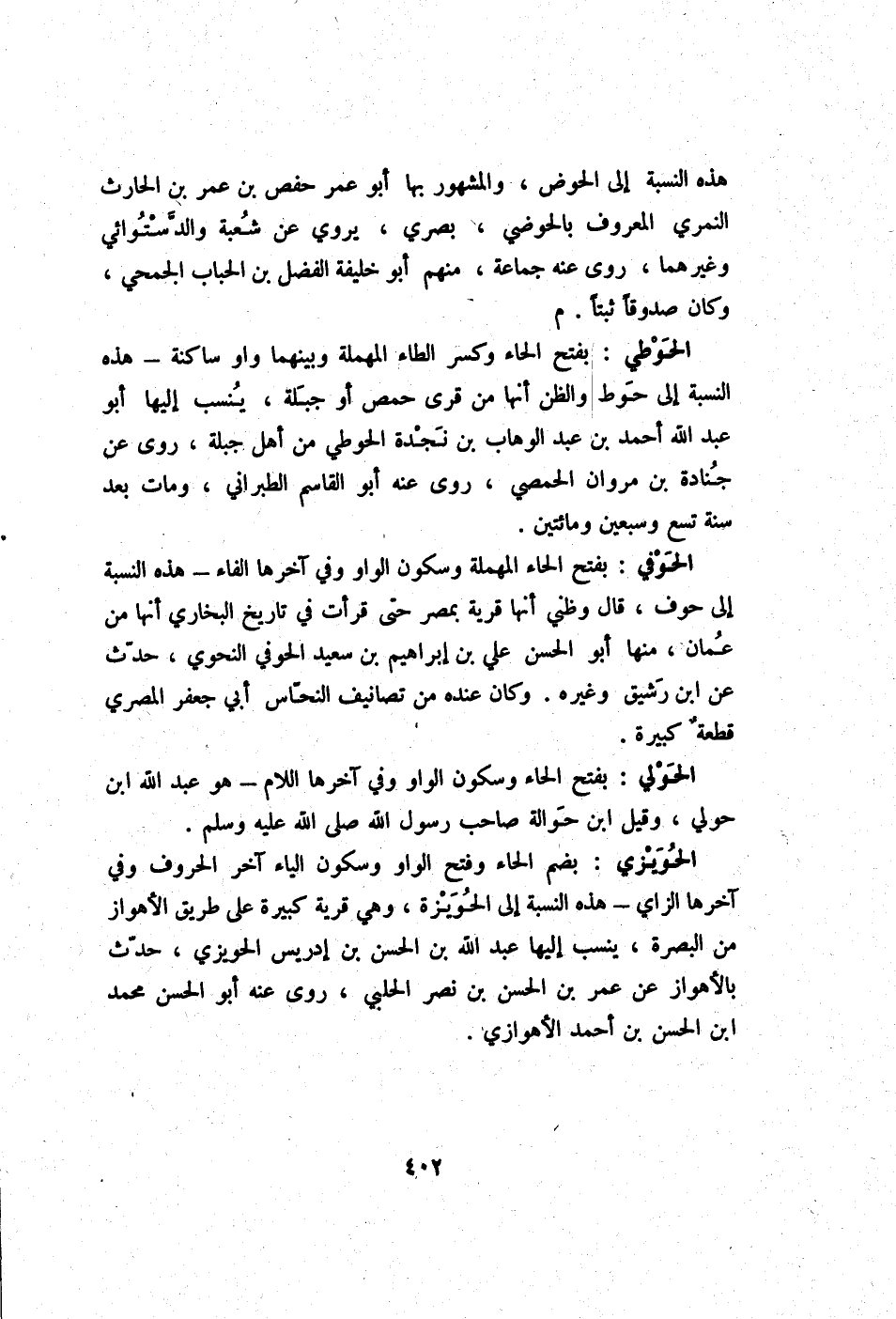 - هَذِه النِّسْبَة إِلَى الْحَوْض وَالْمَشْهُور بهَا أَبُو عمر حَفْص بن عمر بن الْحَارِث النمري الْمَعْرُوف بالحوضي بَصرِي يروي عَن شُعْبَة والدستوائي وَغَيرهمَا روى عَنهُ جمَاعَة مِنْهُم أَبُو خَليفَة الْفضل بن الْحباب الجُمَحِي وَكَانَ صَدُوقًا ثبتا م