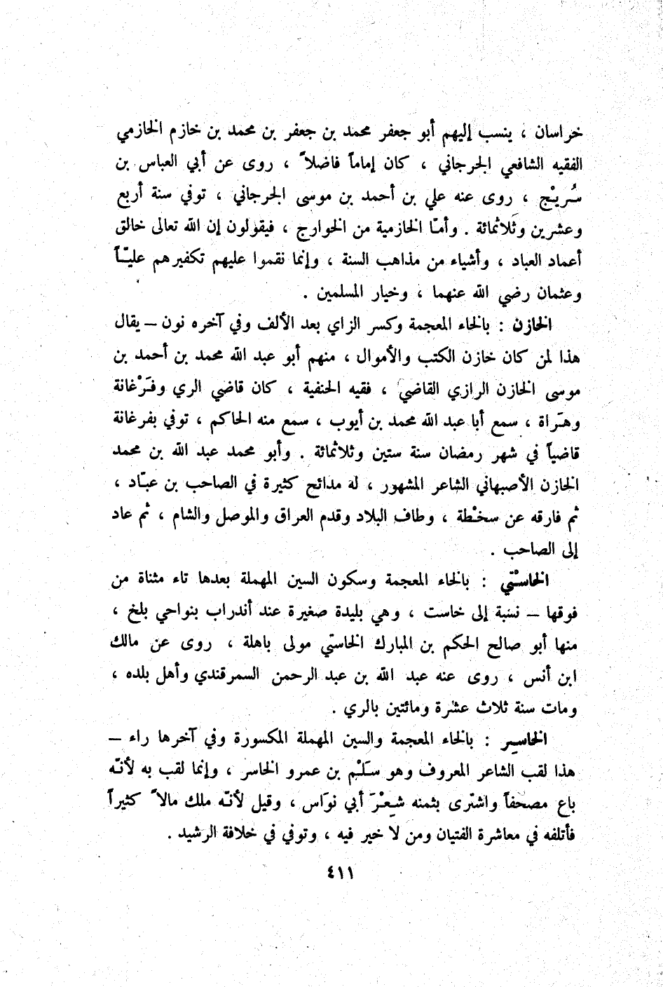 خُرَاسَان ينْسب إِلَيْهِم أَبُو جَعْفَر مُحَمَّد بن جَعْفَر بن مُحَمَّد بن خازم الخازمي الْفَقِيه الشَّافِعِي الْجِرْجَانِيّ كَانَ إِمَامًا فَاضلا روى عَن أبي الْعَبَّاس بن سُرَيج روى عَنهُ عَليّ بن أَحْمد بن مُوسَى الْجِرْجَانِيّ توفّي سنة أَربع وَعشْرين وثلاثمائة وَأما الخازمية من الْخَوَارِج فَيَقُولُونَ إِن الله تَعَالَى خَالق أعماد الْعباد وَأَشْيَاء من مَذَاهِب السّنة وَإِنَّمَا نقموا عَلَيْهِم تكفيرهم عليا وَعُثْمَان رَضِي الله عَنْهُمَا وَخيَار الْمُسلمين