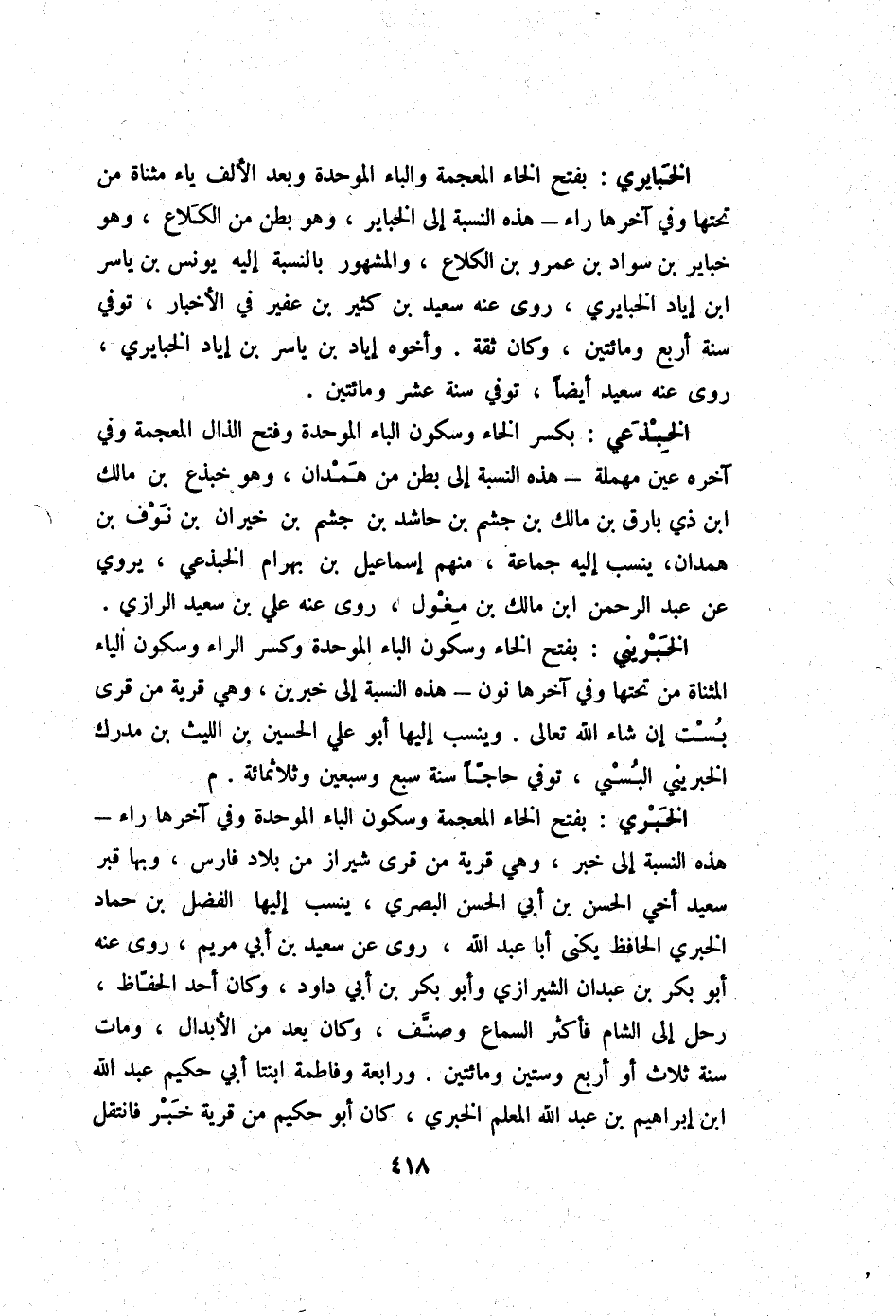الخبري بِفَتْح الْخَاء الْمُعْجَمَة وَسُكُون الْبَاء الْمُوَحدَة وَفِي آخرهَا رَاء - هَذِه النِّسْبَة إِلَى خبر وَهِي قَرْيَة من قرى شيراز من بِلَاد فَارس وَبهَا قبر سعيد أخي الْحسن بن أبي الْحسن الْبَصْرِيّ ينْسب إِلَيْهَا الْفضل بن حَمَّاد الخبري الْحَافِظ يكنى أَبَا عبد الله روى عَن سعيد بن أبي مَرْيَم روى عَنهُ أَبُو بكر بن عَبْدَانِ الشِّيرَازِيّ وَأَبُو بكر بن أبي دَاوُد وَكَانَ أحد الْحفاظ رَحل إِلَى الشَّام فَأكْثر السماع وصنف وَكَانَ يعد من الأبدال وَمَات سنة ثَلَاث أَو أَربع وَسِتِّينَ وَمِائَتَيْنِ ورابعة وَفَاطِمَة ابنتا أبي حَكِيم عبد الله ابْن إِبْرَاهِيم بن عبد الله الْمعلم الخبري كَانَ أَبُو حَكِيم من قَرْيَة خبر فانتقل