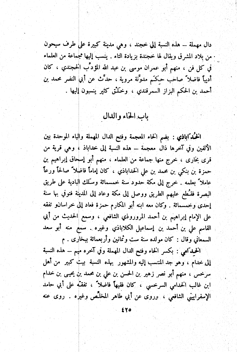 الخداباذي بِضَم الْخَاء الْمُعْجَمَة وَفتح الدَّال الْمُهْملَة وَالْبَاء الْمُوَحدَة بَين الْأَلفَيْنِ وَفِي آخرهَا ذال مُعْجمَة - هَذِه النِّسْبَة إِلَى خداباذ وَهِي قَرْيَة من قرى بُخَارى خرج مِنْهَا جمَاعَة من الْعلمَاء مِنْهُم أَبُو إِسْحَاق إِبْرَاهِيم بن حَمْزَة بن بنكي بن مُحَمَّد بن عَليّ الخداباذي كَانَ إِمَامًا فَاضلا صَالحا ورعا عَاملا بِعِلْمِهِ خرج إِلَى مَكَّة حُدُود سنة خَمْسمِائَة وسلك الْبَادِيَة على طَرِيق الْبَصْرَة فَقطع عَلَيْهِم الطَّرِيق وَوصل إِلَى مَكَّة وَعَاد إِلَى الْمَدِينَة فَتوفي بهَا سنة إِحْدَى وَخَمْسمِائة وَكَانَ مَعَه ابْنه أَبُو المكارم حَمْزَة فَعَاد إِلَى خُرَاسَان وتفقه على الإِمَام إِبْرَاهِيم بن أَحْمد المروروذي الشَّافِعِي وَسمع الحَدِيث من أبي الْقَاسِم عَليّ بن أَحْمد بن إِسْمَاعِيل الكلاباذي وَغَيره سمع مِنْهُ أَبُو سعد السَّمْعَانِيّ وَقَالَ كَانَ مولده سنة سِتّ وَثَمَانِينَ وَأَرْبَعمِائَة ببخارى م
