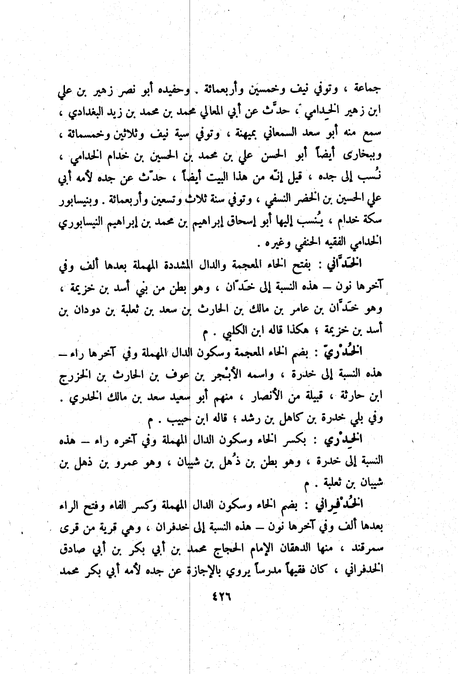 جمَاعَة وَتُوفِّي نَيف وَخمسين وَأَرْبَعمِائَة وحفيده أَبُو نصر زُهَيْر بن عَليّ ابْن زُهَيْر الخدامي حدث عَن أبي الْمَعَالِي مُحَمَّد بن مُحَمَّد بن زيد الْبَغْدَادِيّ سمع مِنْهُ أَبُو سعد السَّمْعَانِيّ بميهنة وَتُوفِّي سنة نَيف وَثَلَاثِينَ وَخَمْسمِائة وببخارى أَيْضا أَبُو الْحسن عَليّ بن مُحَمَّد بن الْحُسَيْن بن خدام الخدامي نسب إِلَى جده قيل إِنَّه من هَذَا الْبَيْت أَيْضا حدث عَن جده لأمه أبي عَليّ الْحُسَيْن بن الْخضر النَّسَفِيّ وَتُوفِّي سنة ثَلَاث وَتِسْعين وَأَرْبَعمِائَة وبنيسابور سكَّة خدام ينْسب إِلَيْهَا أَبُو إِسْحَاق إِبْرَاهِيم بن مُحَمَّد بن إِبْرَاهِيم النَّيْسَابُورِي الخدامي الْفَقِيه الْحَنَفِيّ وَغَيره
