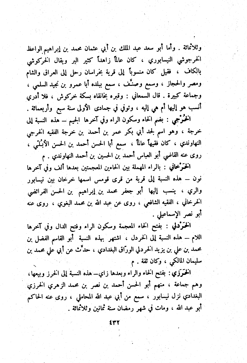 وثلاثمائة وَأما أَبُو سعد عبد الْملك بن أبي عُثْمَان مُحَمَّد بن إِبْرَاهِيم الْوَاعِظ الخرجوشي النَّيْسَابُورِي كَانَ عَالما زاهدا كثير الْبر وَيُقَال الخركوشي بِالْكَاف فَقيل كَانَ مَنْسُوبا إِلَى قَرْيَة بخراسان رَحل إِلَى الْعرَاق وَالشَّام ومصر والحجاز وَسمع وصنف سمع بِبَلَدِهِ أَبَا عَمْرو بن نجيد السّلمِيّ وَجَمَاعَة كَبِيرَة قَالَ السَّمْعَانِيّ وقبره بخانقاه بسكة خركوش فَلَا أَدْرِي أنسب هُوَ إِلَيْهَا أم هِيَ إِلَيْهِ وَتُوفِّي فِي جُمَادَى الأولى سنة سبع وَأَرْبَعمِائَة