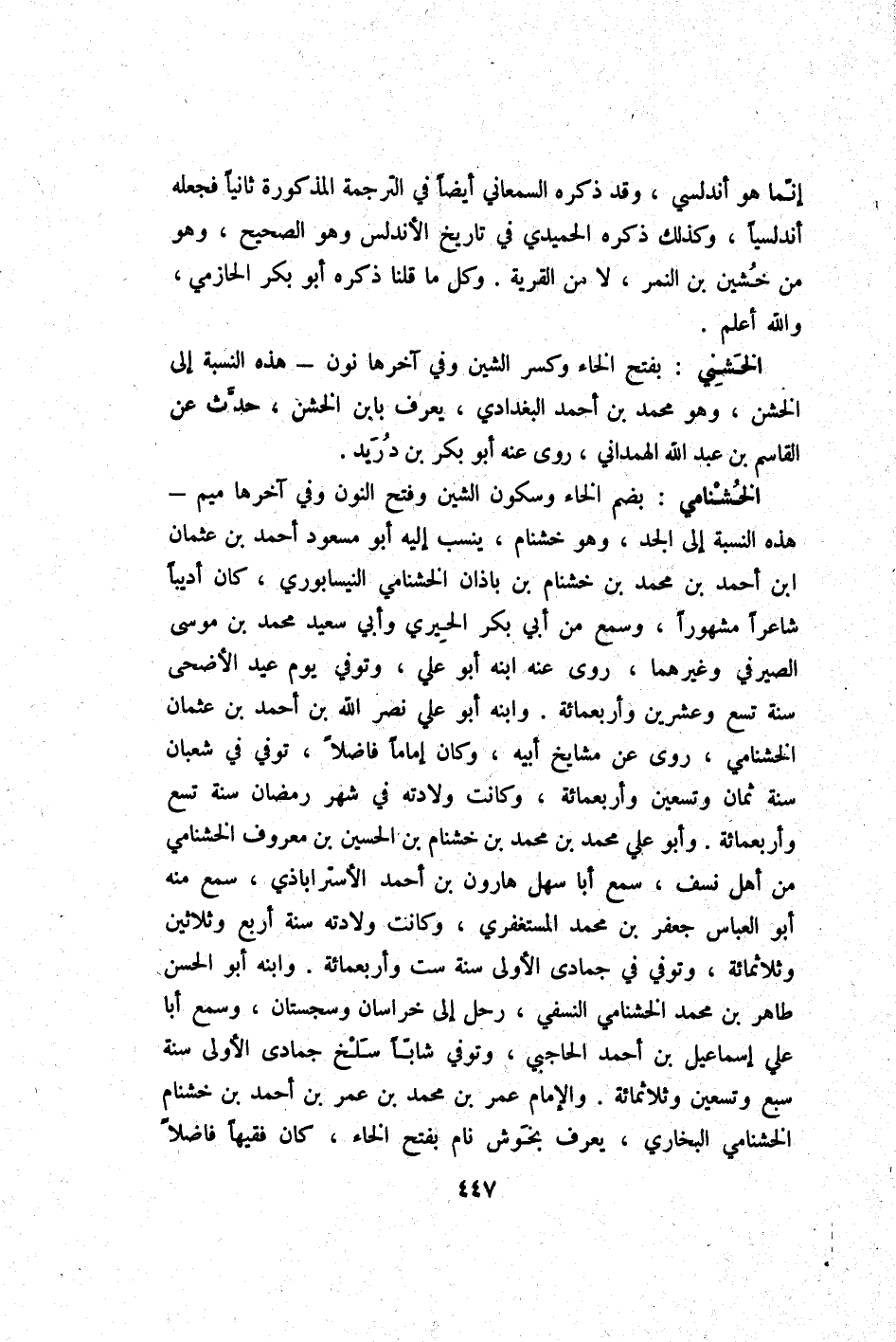إِنَّمَا هُوَ أندلسي وَقد ذكره السَّمْعَانِيّ أَيْضا فِي التَّرْجَمَة الْمَذْكُورَة ثَانِيًا فَجعله أندلسيا وَكَذَلِكَ ذكره الْحميدِي فِي تَارِيخ الأندلس وَهُوَ الصَّحِيح وَهُوَ من خشين بن النمر لَا من الْقرْيَة وكل مَا قُلْنَا ذكره أَبُو بكر الْحَازِمِي وَالله أعلم