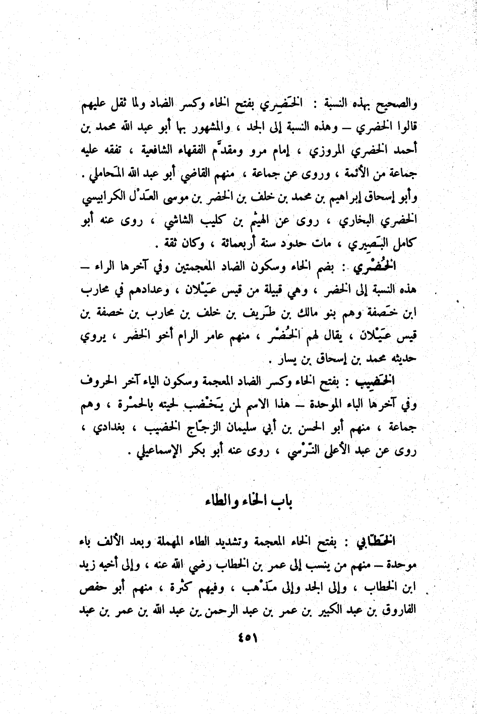 وَالصَّحِيح بِهَذِهِ النِّسْبَة الخضري بِفَتْح الْخَاء وَكسر الضَّاد وَلما ثقل عَلَيْهِم قَالُوا الخضري وَهَذِه النِّسْبَة إِلَى الْجد وَالْمَشْهُور بهَا أَبُو عبد الله بن مُحَمَّد بن أَحْمد الخضري الْمروزِي إِمَام مرو ومقدم الْفُقَهَاء الشَّافِعِيَّة تفقه عَلَيْهِ جمَاعَة من الْأَئِمَّة وروى عَن جمَاعَة مِنْهُم القَاضِي أَبُو عبد الله الْمحَامِلِي وَأَبُو إِسْحَاق إِبْرَاهِيم بن مُحَمَّد بن خلف بن الْخضر بن مُوسَى الْعدْل الْكَرَابِيسِي الخضري البُخَارِيّ روى عَن الْهَيْثَم بن كُلَيْب الشَّاشِي روى عَنهُ أَبُو كَامِل البصيري مَاتَ حُدُود سنة أَرْبَعمِائَة وَكَانَ ثِقَة