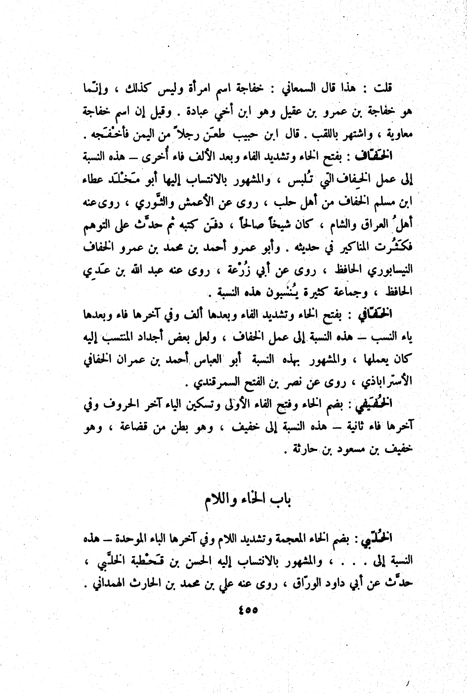 الْخفاف بِفَتْح الْخَاء وَتَشْديد الْفَاء وَبعد الْألف فَاء أُخْرَى - هَذِه النِّسْبَة إِلَى عمل الْخفاف الَّتِي تلبس وَالْمَشْهُور بالانتساب إِلَيْهَا أَبُو مخلد عَطاء ابْن مُسلم الْخفاف من أهل حلب روى عَن الْأَعْمَش وَالثَّوْري روى عَنهُ أهل الْعرَاق وَالشَّام كَانَ شَيخا صَالحا دفن كتبه ثمَّ حدث على التَّوَهُّم فكثرت الْمَنَاكِير فِي حَدِيثه وَأَبُو عَمْرو أَحْمد بن مُحَمَّد بن عَمْرو الْخفاف النَّيْسَابُورِي الْحَافِظ روى عَن أبي زرْعَة روى عَنهُ عبد الله بن عدي الْحَافِظ وَجَمَاعَة كَثِيرَة ينسبون هَذِه النِّسْبَة