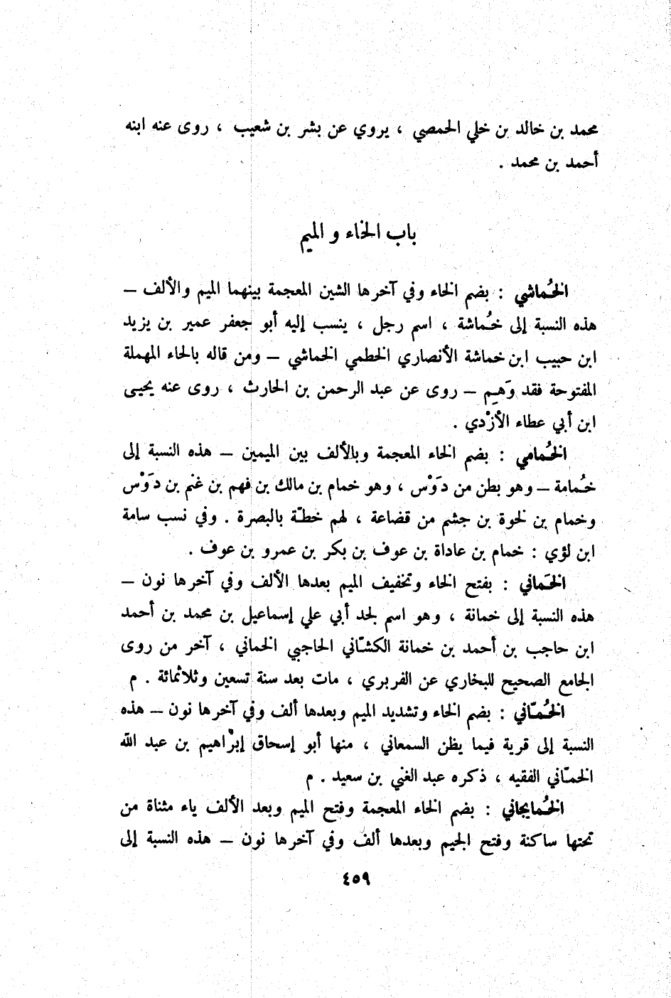 الخماني بِضَم الْخَاء وَتَشْديد الْمِيم وَبعدهَا ألف وَفِي آخرهَا نون - هَذِه النِّسْبَة إِلَى قَرْيَة فِيمَا يظنّ السَّمْعَانِيّ مِنْهَا أَبُو إِسْحَاق إِبْرَاهِيم بن عبد الله الخماني الْفَقِيه ذكره عبد الْغَنِيّ بن سعيد م