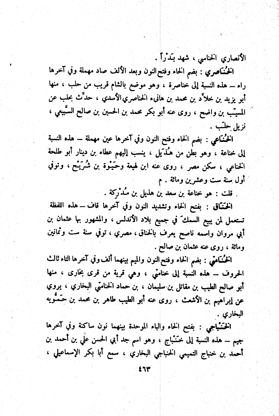 الخناصري بِضَم الْخَاء وَفتح النُّون وَبعد الْألف صَاد مُهْملَة وَفِي آخرهَا رَاء - هَذِه النِّسْبَة إِلَى خناصرة وَهُوَ مَوضِع بِالشَّام قريب من حلب مِنْهَا أَبُو يزِيد بن خَلاد بن مُحَمَّد بن هانىء الخناصري الْأَسدي حدث بحلب عَن الْمسيب بن وَاضح روى عَنهُ أَبُو بكر مُحَمَّد بن الْحُسَيْن بن صَالح السبيعِي نزيل حلب
