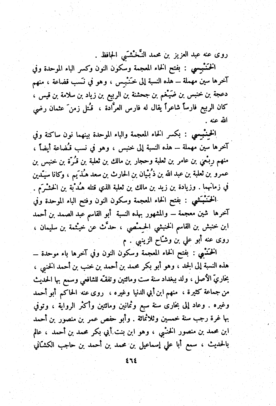 الخنبي بِفَتْح الْخَاء الْمُعْجَمَة وَسُكُون النُّون وَفِي آخرهَا بَاء مُوَحدَة - هَذِه النِّسْبَة إِلَى الْجد وَهُوَ أَبُو بكر مُحَمَّد بن أَحْمد بن خنب بن أَحْمد الخنبي بخاري الأَصْل ولد بِبَغْدَاد سنة سِتّ وَمِائَتَيْنِ وتفقه للشَّافِعِيّ وَسمع بهَا الحَدِيث من جمَاعَة كَثِيرَة مِنْهُم ابْن أبي الدُّنْيَا وَغَيره روى عَنهُ الْحَاكِم أَبُو أَحْمد وَغَيره وَعَاد إِلَى بُخَارى سنة سبع وَثَمَانِينَ وَمِائَتَيْنِ وَأكْثر الرِّوَايَة وَتُوفِّي بهَا غرَّة رَجَب سنة خمسين وثلاثمائة وَأَبُو حَفْص عمر بن مَنْصُور بن أَحْمد ابْن مُحَمَّد بن مَنْصُور الخنبي وَهُوَ ابْن بنت أبي بكر مُحَمَّد بن أَحْمد عَالم بِالْحَدِيثِ سمع أَبَا عَليّ إِسْمَاعِيل بن مُحَمَّد بن أَحْمد بن حَاجِب الكشاني