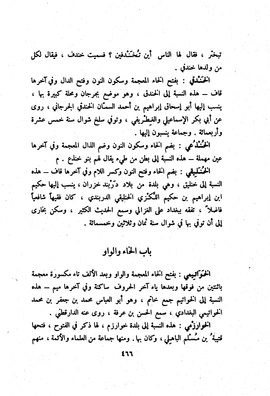 الْخَوَارِزْمِيّ هَذِه النِّسْبَة إِلَى بَلْدَة خوارزم لَهَا ذكر فِي الْفتُوح فتحهَا قُتَيْبَة بن مُسلم الْبَاهِلِيّ وَكَانَ بهَا وَمِنْهَا جمَاعَة من الْعلمَاء وَالْأَئِمَّة مِنْهُم