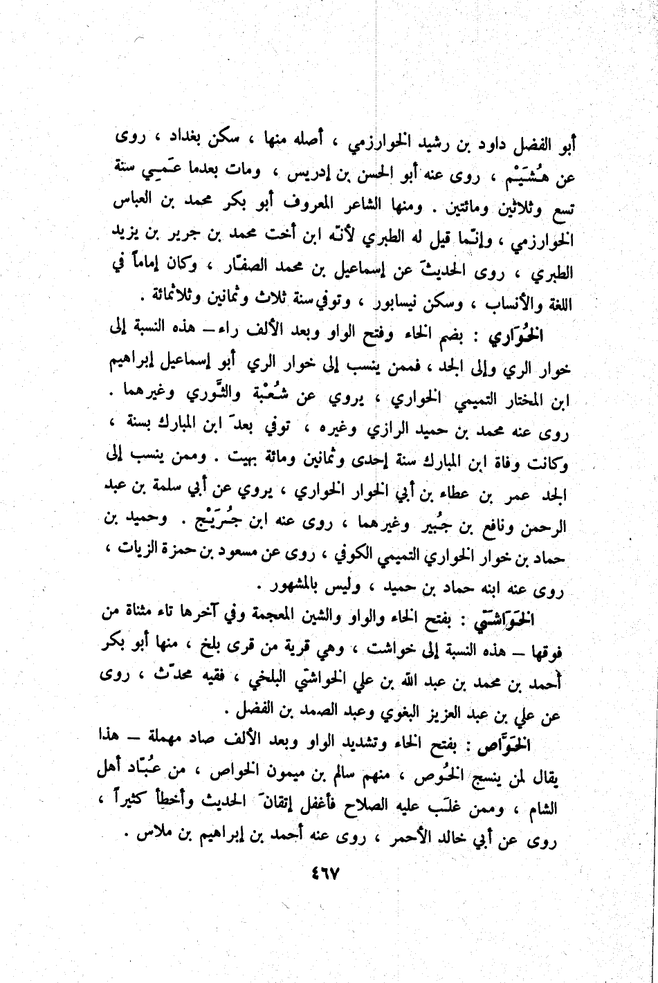 أَبُو الْفضل دَاوُد بن رشيد الْخَوَارِزْمِيّ أَصله مِنْهَا سكن بَغْدَاد روى عَن هشيم روى عَنهُ أَبُو الْحسن بن إِدْرِيس وَمَات بَعْدَمَا عمي سنة تسع وَثَلَاثِينَ وَمِائَتَيْنِ وَمِنْهَا الشَّاعِر الْمَعْرُوف أَبُو بكر مُحَمَّد بن الْعَبَّاس الْخَوَارِزْمِيّ وَإِنَّمَا قيل لَهُ الطَّبَرِيّ لِأَنَّهُ ابْن أُخْت مُحَمَّد بن جرير بن يزِيد الطَّبَرِيّ روى الحَدِيث عَن إِسْمَاعِيل بن مُحَمَّد الصفار وَكَانَ إِمَامًا فِي اللُّغَة والأنساب وَسكن نيسابور وَتُوفِّي سنة ثَلَاث وَثَمَانِينَ وثلاثمائة