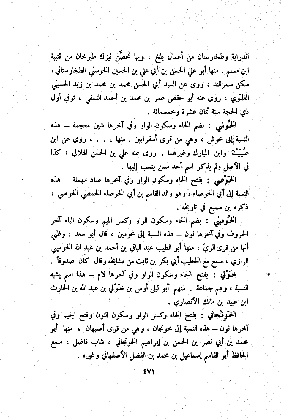 الخوشي بِضَم الْخَاء وَسُكُون الْوَاو وَفِي آخرهَا شين مُعْجمَة - هَذِه النِّسْبَة إِلَى خوش وَهِي من قرى أسفرايين مِنْهَا ... . روى عَن ابْن عُيَيْنَة وَابْن الْمُبَارك وَغَيرهمَا روى عَنهُ عَليّ بن الْحسن الْهِلَالِي كَذَا فِي الأَصْل وَلم يذكر اسْم أحد مِمَّن ينْسب إِلَيْهَا