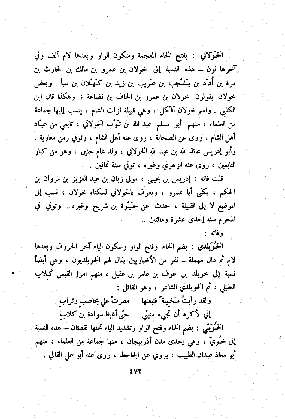 الْخَولَانِيّ بِفَتْح الْخَاء الْمُعْجَمَة وَسُكُون الْوَاو وَبعدهَا لَام ألف وَفِي آخرهَا نون - هَذِه النِّسْبَة إِلَى خولان بن عَمْرو بن مَالك بن الْحَارِث بن مرّة بن أدد بن يشجب بن عريب بن زيد بن كهلان بن سبأ وَبَعض خولان يَقُولُونَ خولان بن عَمْرو بن الحاف بن قضاعة وَهَكَذَا قَالَ ابْن الْكَلْبِيّ وَاسم خولان أفكل وَهِي قَبيلَة نزلت الشَّام ينْسب إِلَيْهَا جمَاعَة من الْعلمَاء مِنْهُم أَبُو مُسلم عبد الله بن ثوب الْخَولَانِيّ تَابِعِيّ من عباد أهل الشَّام روى عَن الصَّحَابَة روى عَنهُ أهل الشَّام وَتُوفِّي زمن مُعَاوِيَة وَأَبُو إِدْرِيس عَائِذ الله بن عبد الله الْخَولَانِيّ ولد عَام حنين وَهُوَ من كبار التَّابِعين روى عَنهُ الزُّهْرِيّ وَغَيره توفّي سنة ثَمَانِينَ
