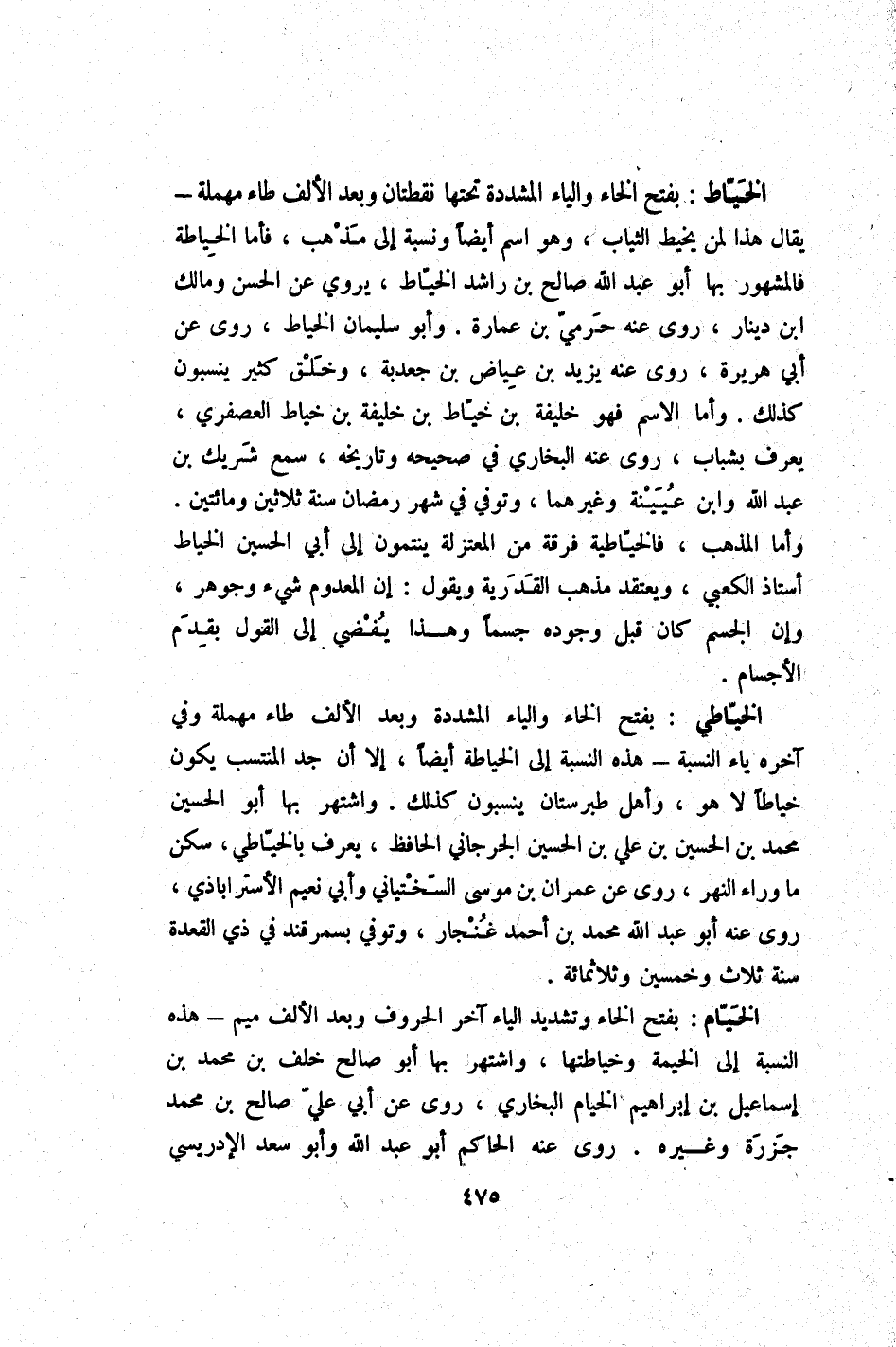 الْخياط بِفَتْح الْخَاء وَالْيَاء الْمُشَدّدَة تحتهَا نقطتان وَبعد الْألف طاء مُهْملَة - يُقَال هَذَا لمن يخيط الثِّيَاب وَهُوَ اسْم أَيْضا وَنسبَة إِلَى مَذْهَب فَأَما الْخياطَة فَالْمَشْهُور بهَا أَبُو عبد الله صَالح بن رَاشد الْخياط يروي عَن الْحسن وَمَالك ابْن دِينَار روى عَنهُ حرمي بن عمَارَة وَأَبُو سُلَيْمَان الْخياط روى عَن أبي هُرَيْرَة روى عَنهُ يزِيد بن عِيَاض بن جعدبة وَخلق كثير ينسبون كَذَلِك وَأما الِاسْم فَهُوَ خَليفَة بن خياط بن خَليفَة بن خياط الْعُصْفُرِي يعرف بشباب روى عَنهُ البُخَارِيّ فِي صَحِيحه وتاريخه سمع شريك بن عبد الله وَابْن عُيَيْنَة وَغَيرهمَا وَتُوفِّي فِي شهر رَمَضَان سنة ثَلَاثِينَ وَمِائَتَيْنِ وَأما الْمَذْهَب فالخياطية فرقة من الْمُعْتَزلَة ينتمون إِلَى أبي الْحُسَيْن الْخياط أستاذ الكعبي ويعتقد مَذْهَب الْقَدَرِيَّة وَيَقُول إِن الْمَعْدُوم شَيْء وجوهر وَإِن الْجِسْم كَانَ قبل وجوده جسما وَهَذَا يُفْضِي إِلَى القَوْل بقدم الْأَجْسَام