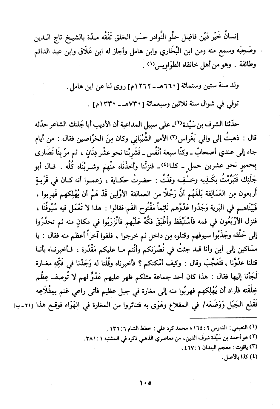 حَدَّثَنَا الشَّرَفُ بْنُ سَيِّدَةَ عَلَى سَبِيلِ الْمُدَاعَبَةِ، أَنَّ الأَدِيبَ أَبَا جَلَنِكَ الشَّاعِرَ حَدَّثَهُ، قَالَ: ذَهَبْتُ إِلَى وَالِي بَغْرَاسَ الأَمِيرِ الشَّيْبَانِيِّ، وَكَانَ مِنَ الْخُرَاصِيِّنَ، فَقَالَ: مِنْ أَيَّامٍ جَاءَ عِنْدِي أَصْحَابٌ، وَكُنَّا سَبْعَةُ أَنْفُسٍ، فَشَرِبْنَا نَحْوَ عَشْرَ دِنَانٍ، ثُمَّ مَرَّ بِنَا نَصَارَى بِحِمْيَرَ نَحْوَ عِشْرِينَ حِمْلٍ.