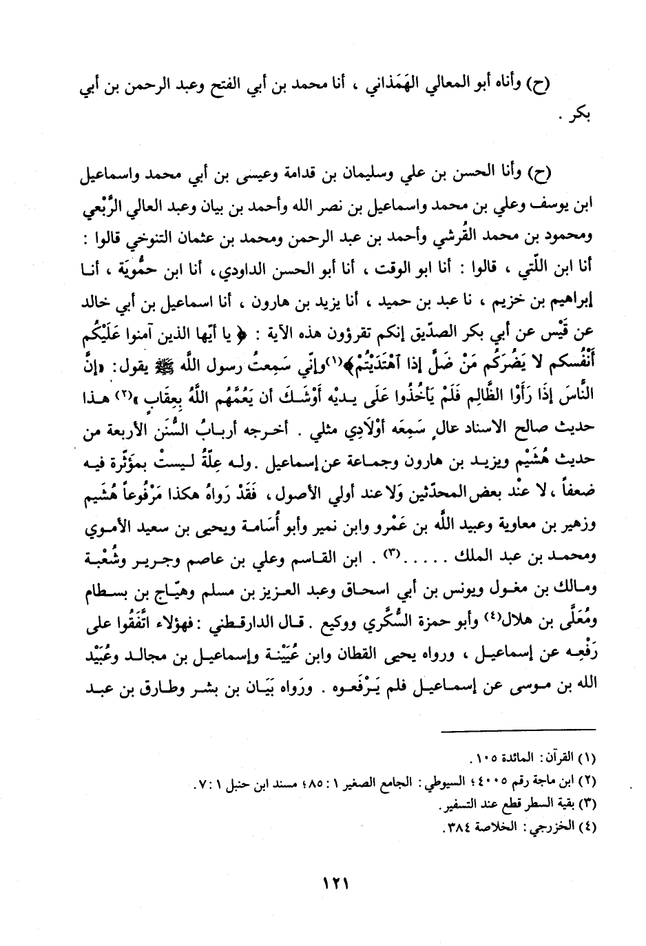 ح وَأَخْبَرَنَا الْحَسَنُ بْنُ عَلِيٍّ، وَسُلَيْمَانُ بْنُ قُدَامَةَ، وَعِيسَى بْنُ أَبِي مُحَمَّدٍ، وَإِسْمَاعِيلُ بْنُ يُوسُفَ، وَعَلِيُّ بْنُ مُحَمَّدٍ وَإِسْمَاعِيلُ بْنُ نَصْرِ اللَّهِ، وَأَحْمَدُ بْنُ بَيَانٍ، وَعَبْدُ الْعَالِي الرَّبَعِيُّ، وَمَحْمُودُ بْنُ مُحَمَّدٍ الْقُرَشِيُّ، وَأَحْمَدُ بْنُ عَبْدِ الرَّحْمَنِ، وَمُحَمَّدُ بْنُ عُثْمَانَ التَّنُوخِيُّ، قَالُوا: أنا ابْنُ اللَّتِّيِّ، قَالُوا: أنا أَبُو الْوَقْتِ، أنا أَبُو الْحَسَنِ الدَّاوُدِيُّ، أنا ابْنُ حَمُّوَيْهِ، أنا إِبْرَاهِيمُ بْنُ خُزَيْمٍ، نا عَبْدُ بْنُ حُمَيْدٍ، أنا يَزِيدُ بْنُ هَارُونَ، أنا إِسْمَاعِيلُ بْنُ أَبِي خَالِدٍ، عَنْ قَيْسٍ، عَنْ أَبِي بَكْرٍ الصِّدِّيقِ إِنَّكُمْ تَقْرَءُونَ هَذِهِ الآيَةَ: {يَأَيُّهَا الَّذِينَ آمَنُوا عَلَيْكُمْ أَنفُسَكُمْ لَا يَضُرُّكُم مَّن ضَلَّ إِذَا اهْتَدَيْتُمْ} وَإِنِّي سَمِعْتُ رَسُولَ اللَّهِ صَلَّى اللَّهُ عَلَيْهِ وَسَلَّمَ يَقُولُ: «إِنَّ النَّاسَ إِذَا رَأَوْا الظَّالِمَ، فَلَمْ يَأْخُذُوا عَلَى يَدَيْهِ أَوْشَكَ أَنْ يَعُمَّهُمُ اللَّهُ بِعِقَابٍ» .
