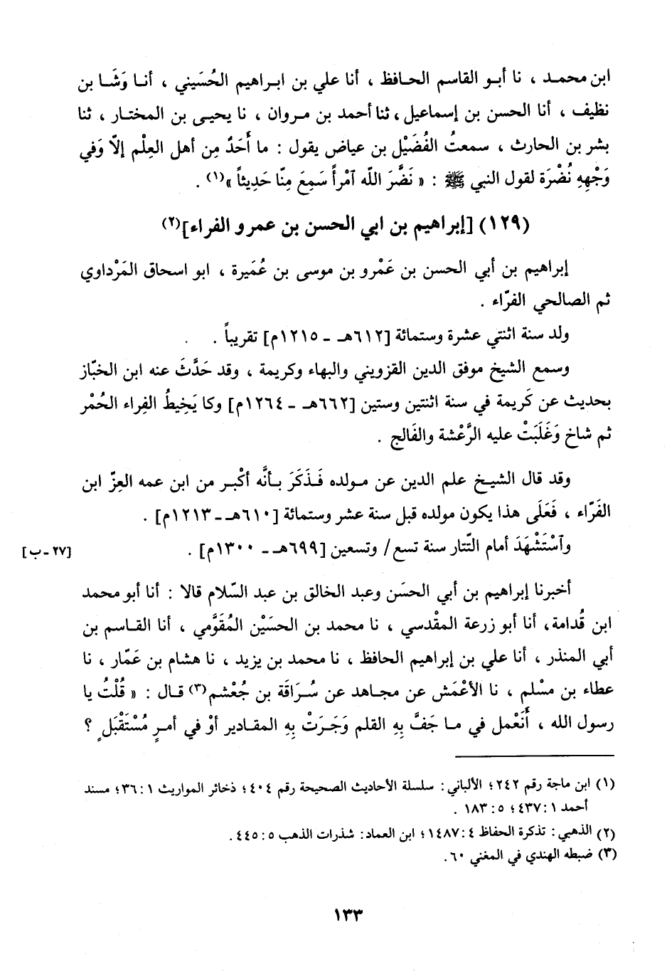 بْنُ مُحَمَّدٍ، نا أَبُو الْقَاسِمِ الْحَافِظُ، أنا عَلِيُّ بْنُ إِبْرَاهِيمَ الْحُسَيْنِيُّ، أنا رَشَأْ بْنُ نَظِيفٍ، أنا الْحَسَنُ بْنُ إِسْمَاعِيلَ، ثنا أَحْمَدُ بْنُ مَرْوَانَ، نا يَحْيَى بْنُ الْمُخْتَارِ، ثنا بِشْرُ بْنُ الْحَارِثِ، سَمِعْتُ الْفُضَيْلَ بْنَ عِيَاضٍ يَقُولُ: مَا أَحَدٌ مِنْ أَهْلِ الْعِلْمِ إِلا وَفِي وَجْهِهِ نَضْرَةٌ لِقَوْلِ النَّبِيِّ صَلَّى اللَّهُ عَلَيْهِ وَسَلَّمَ: «نَضَّرَ اللَّهُ امْرَأً سَمِعَ مِنَّا حَدِيثًا»