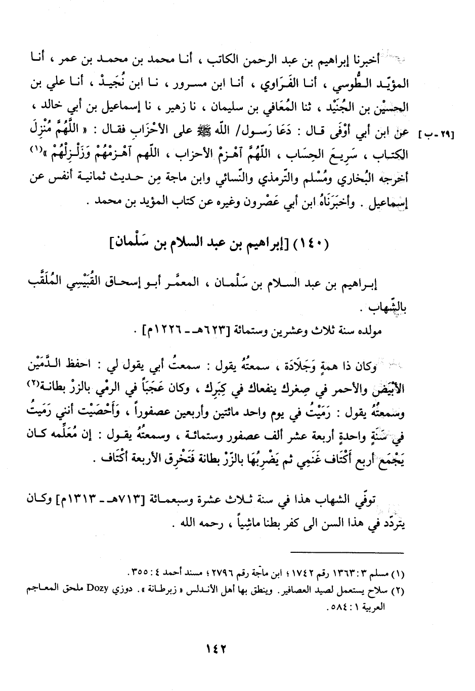 أَخْبَرَنَا إِبْرَاهِيمُ بْنُ عَبْدِ الرَّحْمَنِ الْكَاتِبُ، أنا مُحَمَّدُ بْنُ مُحَمَّدِ بْنِ عُمَرَ، أنا الْمُؤَيَّدُ الطُّوسِيُّ، أنا الْفُرَاوِيُّ، أنا ابْنُ مَسْرُورٍ، نا ابْنُ نُجَيْدٍ، أنا عَلِيُّ بْنُ الْحُسَيْنِ بْنِ الْجُنَيْدِ، ثنا الْمُعَافَى بْنُ سُلَيْمَانَ، نا زُهَيْرٌ، نا إِسْمَاعِيلُ بْنُ أَبِي خَالِدٍ، عَنِ ابْنِ أَبِي أَوْفَى، قَالَ: دَعَا رَسُولُ اللَّهِ صَلَّى اللَّهُ عَلَيْهِ وَسَلَّمَ عَلَى الأَحْزَابِ، فَقَالَ: «اللَّهُمَّ مُنْزِلَ الْكِتَابِ، سَرِيعَ الْحِسَابِ، اللَّهُمَّ اهْزِمِ الأَحْزَابَ، اللَّهُمَّ اهْزِمْهُمْ وَزَلْزِلْهُمْ» .