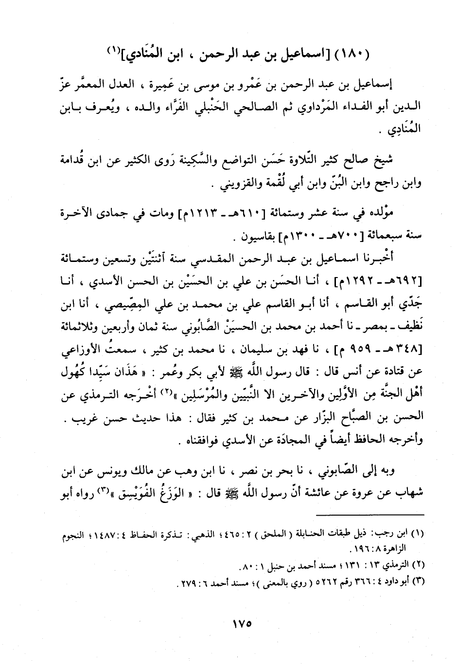 إِسْمَاعِيلُ بْنُ عَبْدِ الرَّحْمَنِ بْنِ عَمْرِو بْنِ مُوسَى بْنِ عُمَيْرَةَ الْعَدْلُ الْمُعَمَّرُ عِزُّ الدِّينِ أَبُو الْفِدَاءِ الْمَرْدَاوِيُّ ثُمَّ الصَّالِحِيُّ الْحَنْبَلِيُّ الْفَرَّاءُ وَالِدُهُ وَيُعْرَفُ بِابْنِ الْمُنَادِي