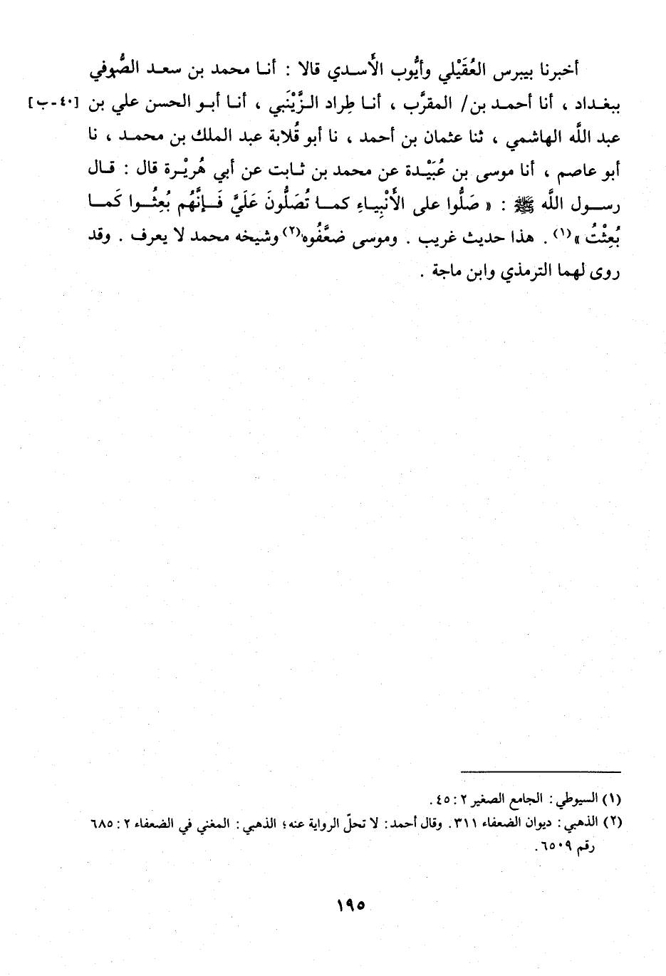 أَخْبَرَنَا بَيْبَرْسُ الْعُقَيْلِيُّ، وَأَيُّوبُ الأَسْدِيُّ، قَالا: أنا مُحَمَّدُ بْنُ سَعْدٍ الصُّوفِيُّ، بِبَغْدَادَ، أنا أَحْمَدُ بْنُ الْمُقَرَّبِ، أنا طِرَادٌ الزَّيْنَبِيُّ، نا أَبُو الْحَسَنِ عَلِيُّ بْنُ عَبْدِ اللَّهِ الْهَاشِمِيُّ، ثنا عُثْمَانُ بْنُ أَحْمَدَ، نا أَبُو قِلابَةَ عَبْدُ الْمَلِكِ بْنُ مُحَمَّدٍ، نا أَبُو عَاصِمٍ، أنا مُوسَى بْنُ عُبَيْدَةَ، عَنْ مُحَمَّدِ بْنِ ثَابِتٍ، عَنْ أَبِي هُرَيْرَةَ، قَالَ: قَالَ رَسُولُ اللَّهِ صَلَّى اللَّهُ عَلَيْهِ وَسَلَّمَ: «صَلُّوا عَلَى الأَنْبِيَاءِ كَمَا تُصَلُّونَ عَلَيَّ، فَإِنَّهُمْ بُعِثُوا كَمَا بُعِثْتُ» .
