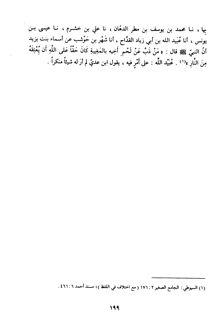 بِهَا، نا مُحَمَّدُ بْنُ يُوسُفَ بْنِ مَطَرٍ الدَّهَّانُ، نا عَلِيُّ بْنُ خََشْرَمٍ، نا عِيسَى بْنُ يُونُسَ، أنا عُبَيْدُ اللَّهِ بْنُ أَبِي زِيَادٍ الْقَدَّاحُ، أنا شَهْرُ بْنُ حَوْشَبٍ، عَنْ أَسْمَاءَ بِنْتِ يَزِيدَ، أَنَّ النَّبِيَّ صَلَّى اللَّهُ عَلَيْهِ وَسَلَّمَ قَالَ: «مَنْ ذَبَّ عَنْ لَحْمِ أَخِيهِ بِالْمَغِيبَةِ كَانَ حَقًّا عَلَى اللَّهِ أَنْ يُعْتِقَهُ مِنَ النَّارِ» .