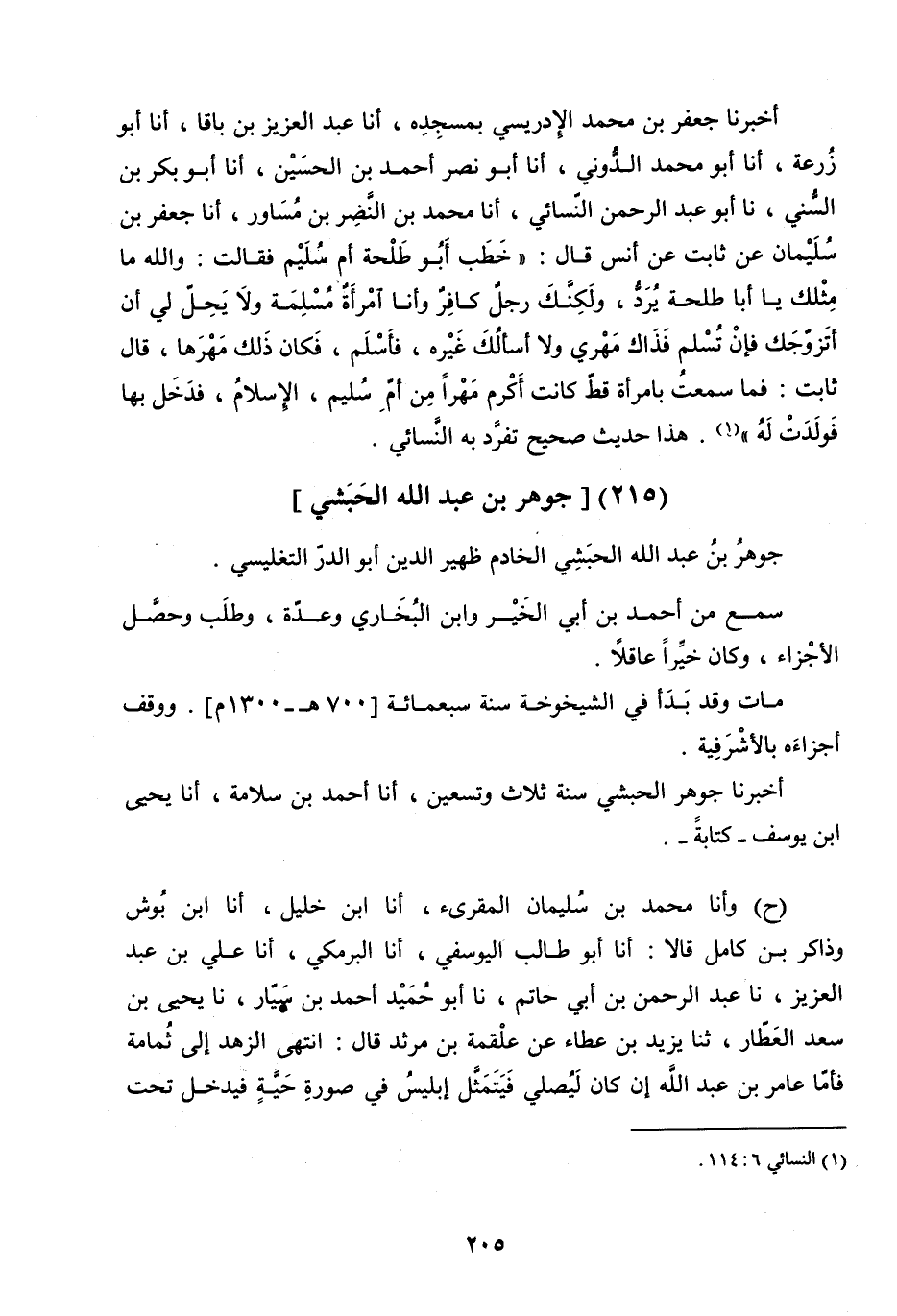 -10 - 1: 127 - أَخْبَرَنَا جَعْفَرُ بْنُ مُحَمَّدٍ الإِدْرِيسِيُّ، بِمَسْجِدِهِ، أنا عَبْدُ الْعَزِيزِ بْنُ بَاقَا، أنا أَبُو زُرْعَةَ، أنا أَبُو مُحَمَّدٍ الدُّونِيُّ، أنا أَبُو نَصْرٍ أَحْمَدُ بْنُ الْحُسَيْنِ، أنا أَبُو بَكْرِ بْنُ السُّنِّيِّ، نا أَبُو عَبْدِ الرَّحْمَنِ النَّسَائِيُّ، أنا مُحَمَّدُ بْنُ النَّضْرِ بْنِ مُسَاوِرٍ، أنا جَعْفَرُ بْنُ سُلَيْمَانَ، عَنْ ثَابِتٍ، عَنْ أَنَسٍ، قَالَ: خَطَبَ أَبُو طَلْحَةَ أُمَّ سُلَيْمٍ، فَقَالَتْ: وَاللَّهِ مَا مِثْلُكَ يَا أَبَا طَلْحَةَ يُرَدُّ، وَلَكِنَّكَ رَجُلٌ كَافِرٌ، وَأَنَا امْرَأَةٌ مُسْلِمَةٌ، وَلا يَحِلُّ لِي أَنْ أَتَزَوَّجَكَ، فَإِنْ تُسْلِمْ فَذَاكَ مَهْرِي، وَلا أَسْأَلُكَ غَيْرَهُ، فَأَسْلَمَ، فَكَانَ ذَلِكَ مَهْرَهَا، قَالَ ثَابِتٌ: فَمَا سَمِعْتُ بِامْرَأَةٍ قَطُّ كَانَتْ أَكْرَمَ مَهْرًا مِنْ أُمِّ سُلَيْمٍ، الإِسْلامُ، فَدَخَلَ بِهَا فَوَلَدَتْ لَهُ.