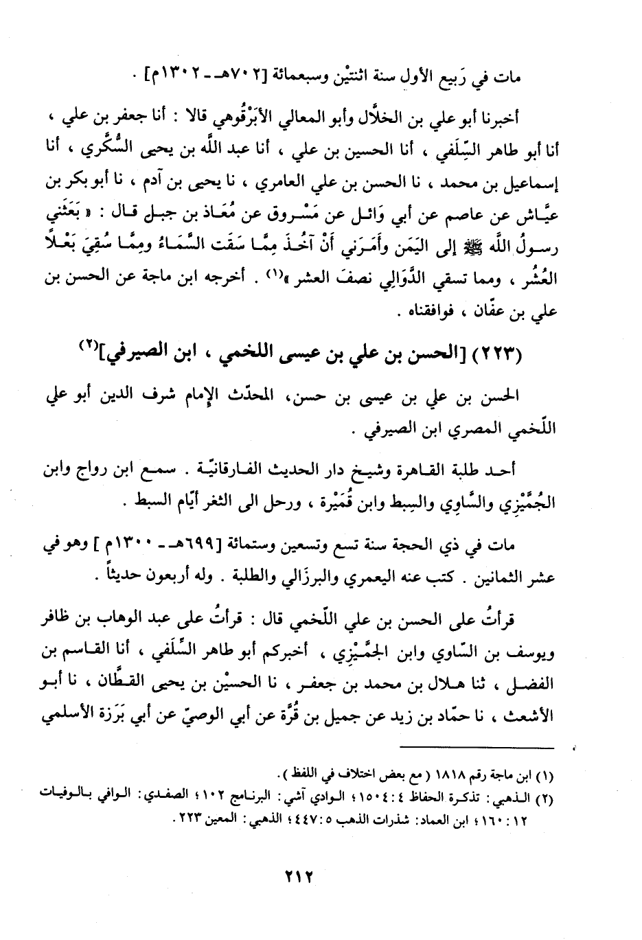 قَرَأْتُ عَلَى الْحَسَنِ بْنِ عَلِيٍّ اللَّخْمِيِّ، قَالَ: قَرَأْتُ عَلَى عَبْدِ الْوَهَّابِ بْنِ ظَافِرٍ، وَيُوسُفَ بْنِ السَّاوِيِّ، وَابْنِ الْجُمَّيْزِيِّ، أَخْبَرَكُمْ أَبُو طَاهِرٍ السَّلَفِيُّ، أنا الْقَاسِمُ بْنُ الْفَضْلِ، ثنا هِلالُ بْنُ مُحَمَّدِ بْنِ جَعْفَرٍ، نا الْحُسَيْنُ بْنُ يَحْيَى الْقَطَّانُ، نا أَبُو الأَشْعَثِ، نا حَمَّادُ بْنُ زَيْدٍ، عَنْ جَمِيلِ بْنِ قُرَّةَ، عَنْ أَبِي الْوَصِيِّ، عَنْ أَبِي بَرْزَةَ الأَسْلَمِيِّ،