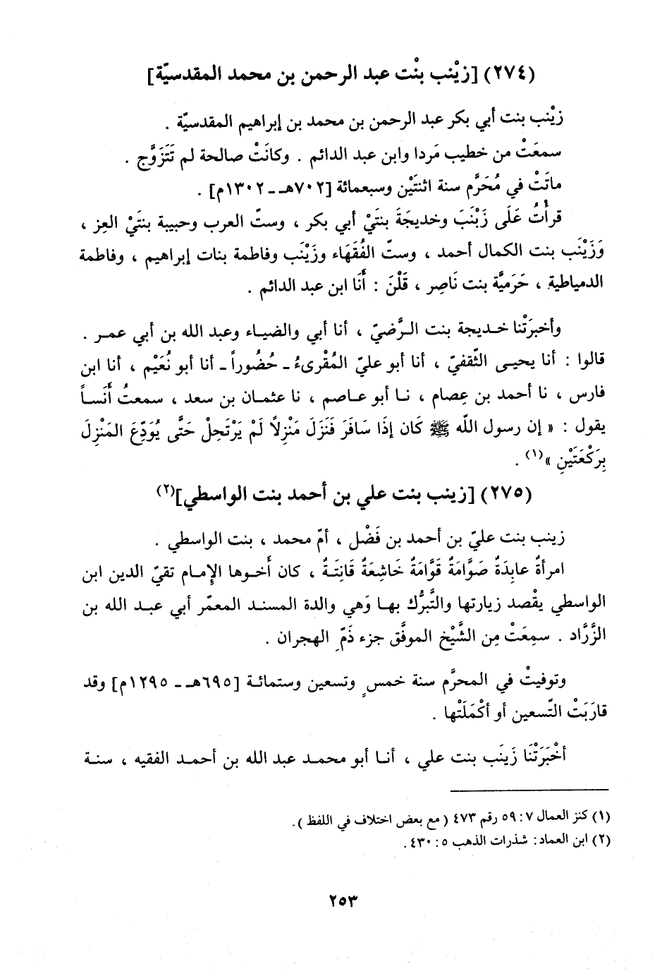 -10 - 1: 155 - قَرَأْتُ عَلَى زَيْنَبَ، وَخَدِيجَةَ بِنْتَيْ أَبِي بَكْرٍ، وَسِتِّ الْعَرَبِ، وَحَبِيبَةَ بِنْتَيِ الْعِزِّ، وَزَيْنَبَ بِنْتِ الْكَمَالِ أَحْمَدَ، وَسِتِّ الْفُقَهَاءِ، وَزَيْنَبَ، وَفَاطِمَةَ بَنَاتِ إِبْرَاهِيمَ، وَفَاطِمَةَ الدِّمْيَاطِيَّةِ، حَرَمِيَّةَ بِنْتِ نَاصِرٍ، قُلْنَ: أنا ابْنُ عَبْدِ الدَّائِمِ.