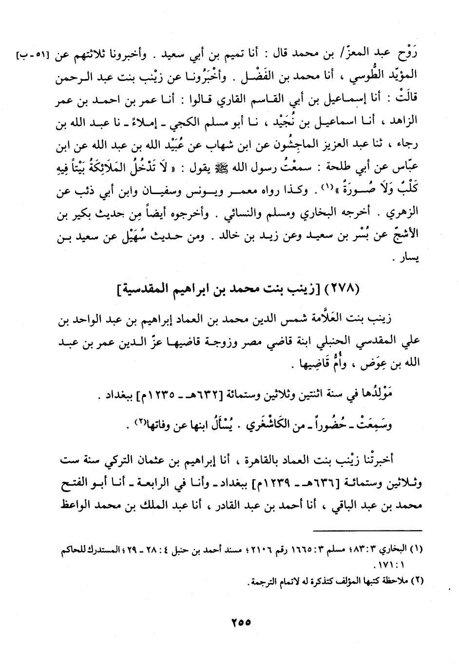 رَوْحٍ عَبْدِ الْمُعِزِّ بْنِ مُحَمَّدٍ، قَالَ: أنا تَمِيمُ بْنُ أَبِي سَعِيدٍ، وَأَخْبَرُونَا ثَلاثَتُهُمْ، عَنِ الْمُؤَيَّدِ الطُّوسِيِّ، أنا مُحَمَّدُ بْنُ الْفَضْلِ، وَأَخْبَرُونَا عَنْ زَيْنَبَ بِنْتِ عَبْدِ الرَّحْمَنِ، قَالَتْ: أنا إِسْمَاعِيلُ بْنُ أَبِي الْقَاسِمِ الْقَارِي، قَالَ: أنا عُمَرُ بْنُ أَحْمَدَ بْنِ عُمَرَ الزَّاهِدُ، أنا إِسْمَاعِيلُ بْنُ نُجَيْدٍ، نا أَبُو مُسْلِمٍ الْكَجِّيُّ، إِمْلاءً، نا عَبْدُ اللَّهِ بْنُ رَجَاءٍ، ثنا عَبْدُ الْعَزِيزِ الْمَاجِشُونُ، عَنِ ابْنِ شِهَابٍ، عَنْ عُبَيْدِ اللَّهِ بْنِ عَبْدِ اللَّهِ، عَنِ ابْنِ عَبَّاسٍ، عَنْ أَبِي طَلْحَةَ، سَمِعْتُ رَسُولَ اللَّهِ صَلَّى اللَّهُ عَلَيْهِ وَسَلَّمَ يَقُولُ: «لا تَدْخُلُ الْمَلائِكَةُ بَيْتًا فِيهِ كَلْبٌ وَلا صُورَةٌ» .