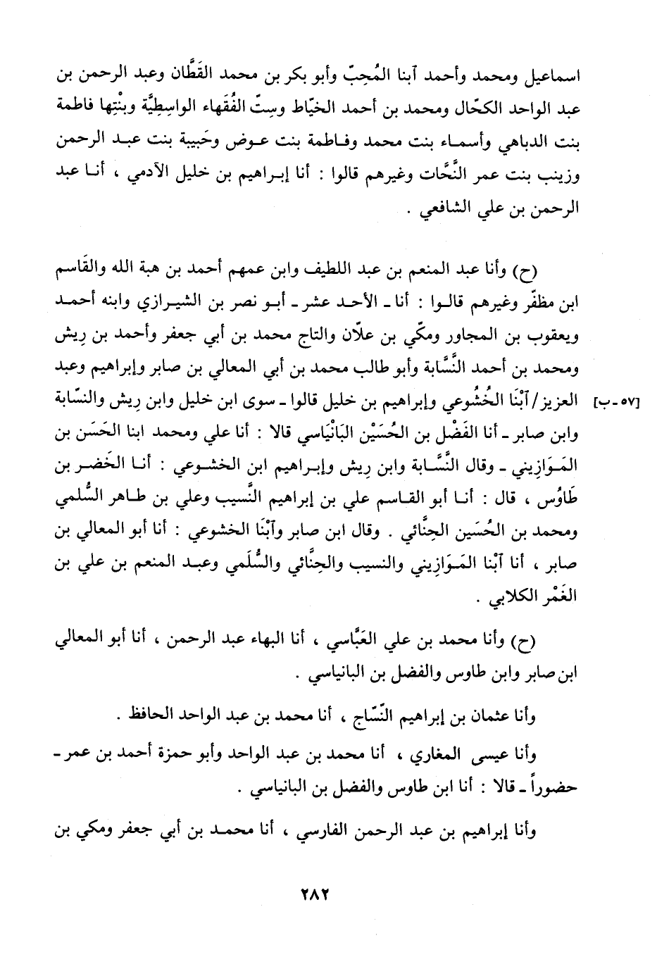 إِسْمَاعِيلَ، وَمُحَمَّدٌ، وَأَحْمَدُ ابْنَا الْمُحِبِّ، وَأَبُو بَكْرِ بْنُ مُحَمَّدٍ الْقَطَّانُ، وَعَبْدُ الرَّحْمَنِ بْنُ عَبْدِ الْوَاحِدِ الْكَحَّالُ، وَمُحَمَّدُ بْنُ أَحْمَدَ الْخَيَّاطُ، وَسِتُّ الْفُقَهَاءِ الْوَاسِطِيَّةُ، وَبِنْتُهَا فَاطِمَةُ بِنْتُ الدباهي، وَأَسْمَاءُ بِنْتُ مُحَمَّدٍ، وَفَاطِمَةُ بِنْتُ عَوَضٍ، وَحَبِيبَةُ بِنْتُ عَبْدِ الرَّحْمَنِ، وَزَيْنَبُ بِنْتُ عُمَرَ النَّحَّاتُ، وَغَيْرُهُمْ قَالُوا: أنا إِبْرَاهِيمُ بْنُ خَلِيلٍ الآدَمِيُّ، أنا عَبْدُ الرَّحْمَنِ بْنُ عَلِيٍّ الشَّافِعِيُّ.