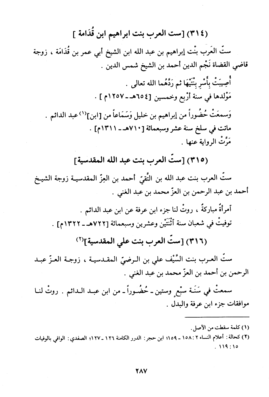سِتُّ الْعَرَبِ بِنْتُ إِبْرَاهِيمَ بْنِ عَبْدِ اللَّهِ ابْنِ الشَّيْخِ أَبِي عُمَرَ بْنِ قُدَامَةَ زَوْجَةُ قَاضِي الْقُضَاةِ نَجْمِ الدِّينِ أَحْمَدَ ابْنِ الشَّيْخِ شَمْسِ الدِّينِ