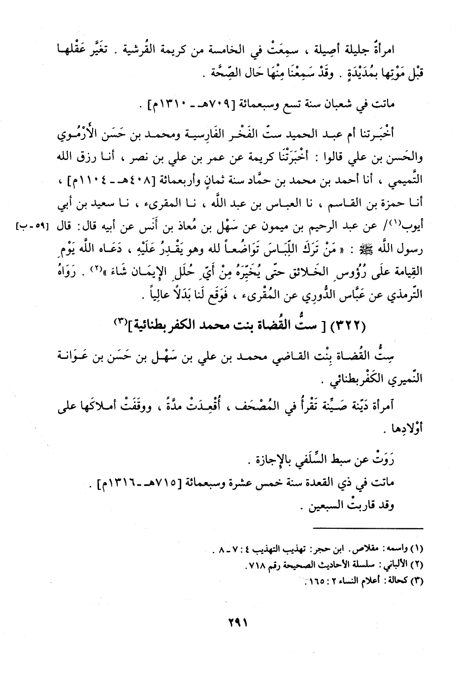 امْرَأَةٌ دَيِّنَةٌ صَيِّنَةٌ تَقْرَأُ فِي الْمُصْحَفِ، أُقْعِدَتْ مُدَّةً، وَوَقَفَتْ أَمْلاكَهَا عَلَى أَوْلادِهَا رَوَتْ عَنْ سِبْطِ السَّلَفِيِّ بِالإِجَازَةِ.