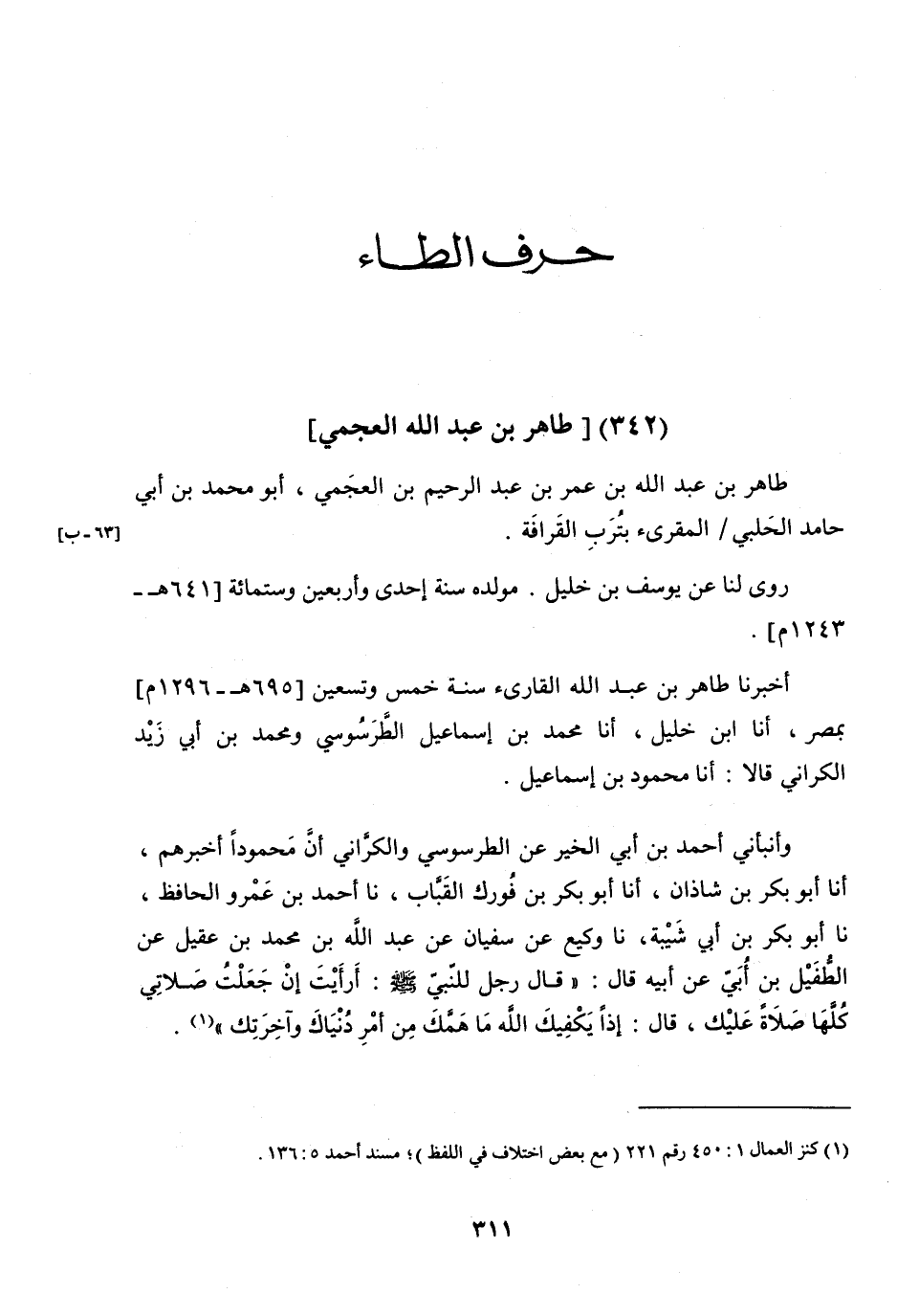 أَخْبَرَنَا طَاهِرُ بْنُ عَبْدِ اللَّهِ الْقَارِئُ، سَنَةَ خَمْسٍ وَتِسْعِينَ وَسِتِّ مِائَةٍ، بِمِصْرَ، أنا ابْنُ خَلِيلٍ، أنا مُحَمَّدُ بْنُ إِسْمَاعِيلَ الطَّرَسُوسِيُّ، وَمُحَمَّدُ بْنُ أَبِي زَيْدٍ الْكَرَّانِيُّ، قَالا: أنا مَحْمُودُ بْنُ إِسْمَاعِيلَ.