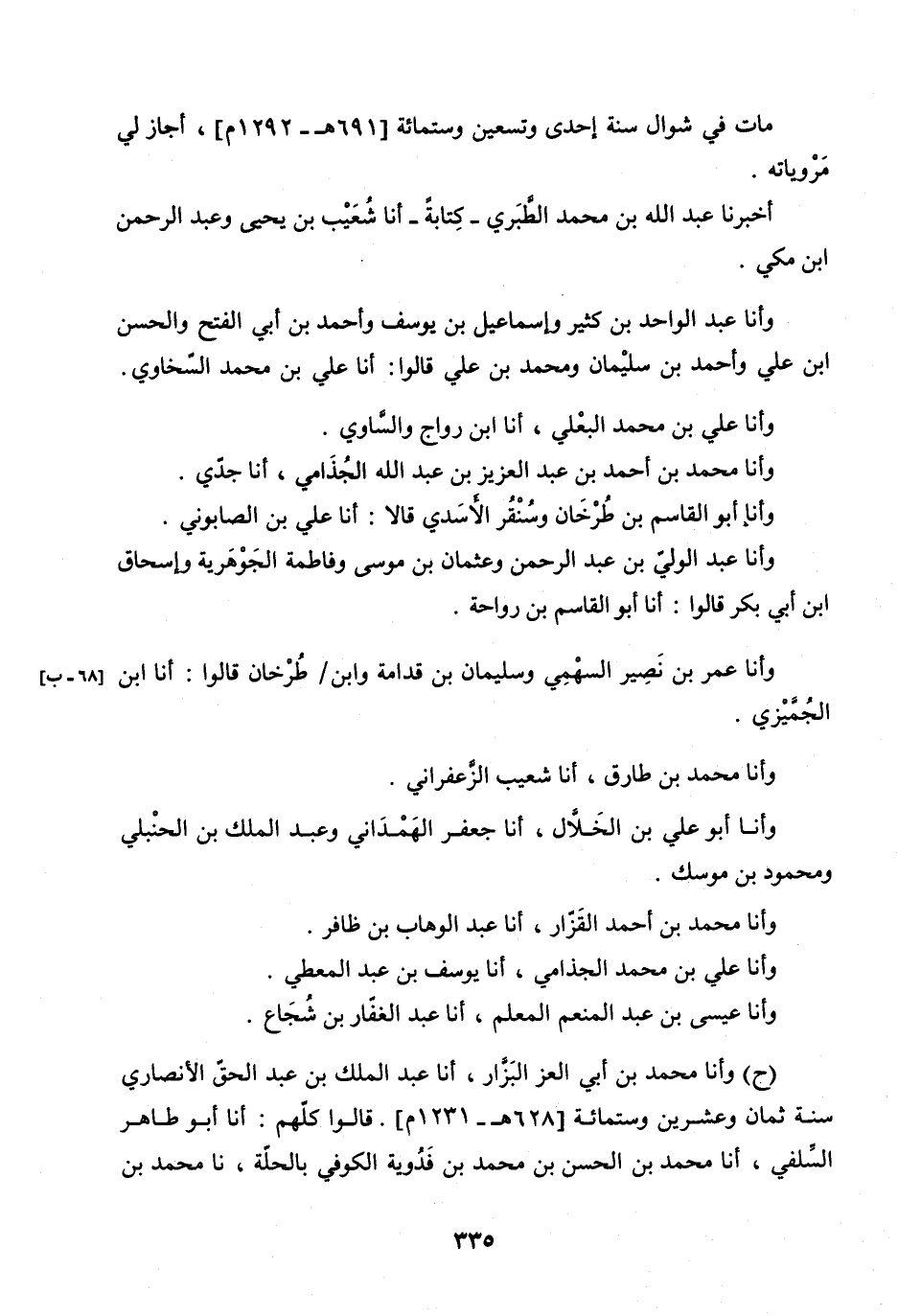 وَأَخْبَرَنَا عَبْدُ الْوَاحِدِ بْنُ كَثِيرٍ، وَإِسْمَاعِيلُ بْنُ يُوسُفَ، وَأَحْمَدُ بْنُ أَبِي الْفَتْحِ، وَالْحَسَنُ بْنُ عَلِيٍّ، وَأَحْمَدُ بْنُ سُلَيْمَانَ، وَمُحَمَّدُ بْنُ عَلِيٍّ، قَالُوا: أنا عَلِيُّ بْنُ مُحَمَّدٍ السَّخَاوِيُّ.