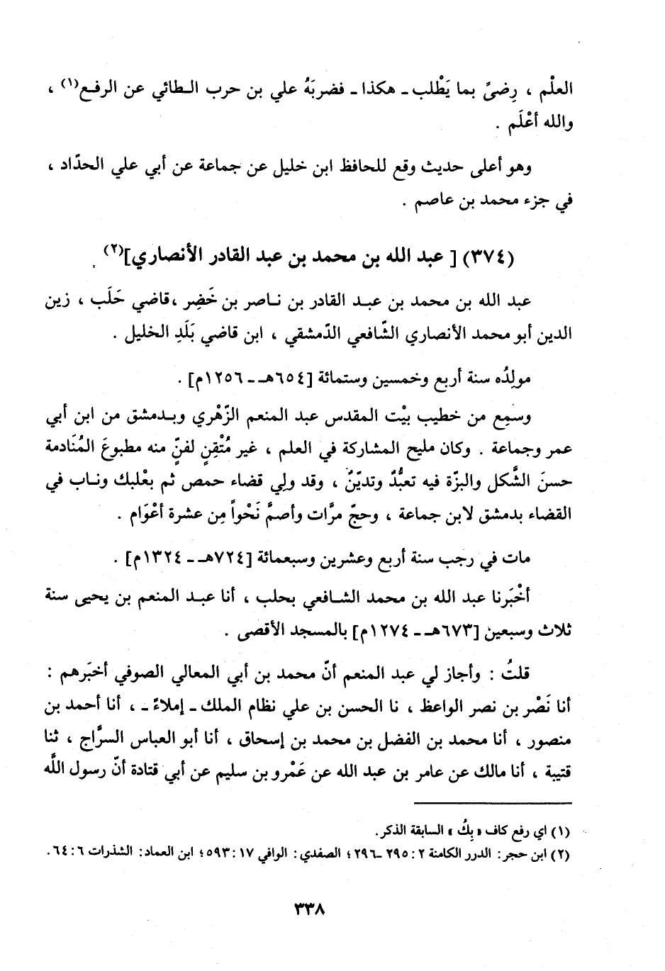 أَخْبَرَنَا عَبْدُ اللَّهِ بْنُ مُحَمَّدٍ الشَّافِعِيُّ، بِحَلَبَ، أنا عَبْدُ الْمُنْعِمِ بْنُ يَحْيَى، سَنَةَ ثَلاثٍ وَسَبْعِينَ وَسِتِّ مِائَةٍ، بِالْمَسْجِدِ الأَقْصَى.