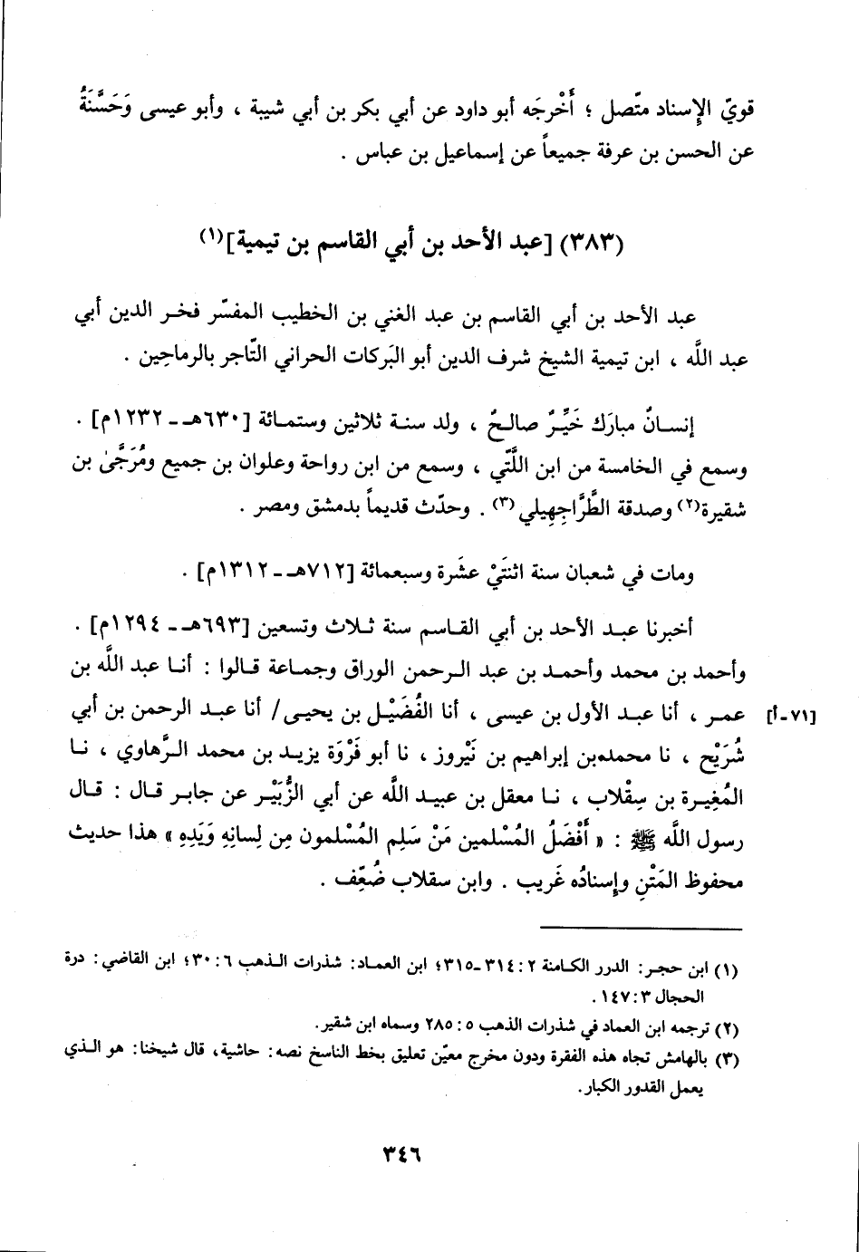 عَبْدُ الأَحَدِ بْنُ أَبِي الْقَاسِمِ بْنِ عَبْدِ الْغَنِيِّ بْنِ الْخَطِيبِ الْمُفَسِّرُ فَخْرُ الدِّينِ أَبِي عَبْدِ اللَّهِ ابْنُ تَيْمِيَةَ الشَّيْخُ شَرَفُ الدِّينِ أَبُو الْبَرَكَاتِ الْحَرَّانِيُّ التَّاجِرُ بِالرّماحِينِ