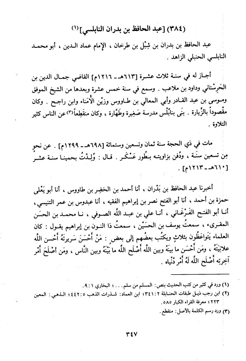 عَبْدُ الْحَافِظِ بْنُ بَدْرَانَ بْنِ شِبْلِ بْنِ طَرْخَانَ الإِمَامُ عِمَادُ الدِّينِ أَبُو مُحَمَّدٍ النَّابُلْسِيُّ الْحَنْبَلِيُّ الزَّاهِدُ