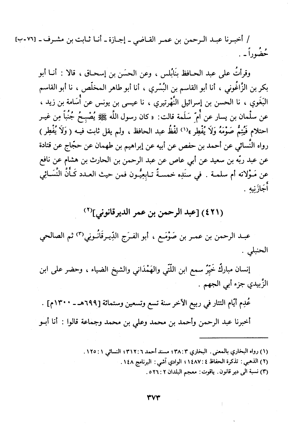 رَوَاهُ النَّسَائِيُّ، عَنْ أَحْمَدَ بْنِ حَفْصٍ، عَنْ أَبِيهِ، عَنْ إِبْرَاهِيمَ بْنِ طَهْمَانَ، عَنْ حَجَّاجٍ، عَنْ قَتَادَةَ، عَنْ عَبْدِ رَبِّهِ بْنِ سَعِيدٍ، عَنْ أَبِي عَاصٍ، عَنْ عَبْدِ الرَّحْمَنِ بْنِ الْحَارِثِ بْنِ هِشَامٍ، عَنْ نَافِعٍ، عَنْ مَوْلاتِهِ أُمِّ سَلَمَةَ، فِي سَنَدِهِ خَمْسَةٌ تَابِعِيُّونَ فَمِنْ حَيْثُ الْعَدَدِ كَأَنَّ النَّسَائِيَّ أَجَازَنِيهِ