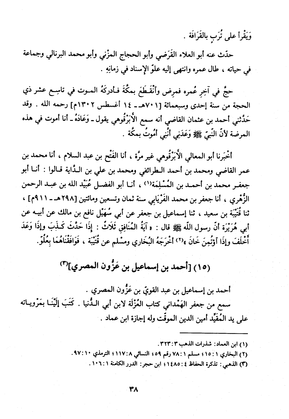 أَخْبَرَنَا أَبُو الْمَعَالِي الأَبَرْقُوهِيُّ غَيْرَ مَرَّةٍ، أنا الْفَتْحُ بْنُ عَبْدِ السَّلامِ، أنا مُحَمَّدُ بْنُ عُمَرَ الْقَاضِي، وَمُحَمَّدُ بْنُ أَحْمَدَ الطَّرَائِفِيُّ، وَمُحَمَّدُ بْنُ عَلِيِّ بْنِ الدَّايَةِ، قَالُوا: أنا أَبُو جَعْفَرٍ مُحَمَّدُ بْنُ أَحْمَدَ بْنِ الْمَسْلَمَةِ، أنا أَبُو الْفَضْلِ عُبَيْدُ اللَّهِ بْنُ عَبْدِ الرَّحْمَنِ الزُّهْرِيُّ، أنا جَعْفَرُ بْنُ مُحَمَّدٍ الْفِرْيَابِيُّ، سَنَةَ ثَمَانٍ وَتِسْعِينَ وَمِائَتَيْنِ، ثنا قُتَيْبَةُ بْنُ سَعِيدٍ، ثنا إِسْمَاعِيلُ بْنُ جَعْفَرٍ، عَنْ أَبِي سُهَيْلٍ نَافِعِ بْنِ مَالِكٍ، عَنْ أَبِيهِ، عَنْ أَبِي هُرَيْرَةَ، أَنَّ رَسُولَ اللَّهِ صَلَّى اللَّهُ عَلَيْهِ وَسَلَّمَ قَالَ: " آيَةُ الْمُنَافِقِ ثَلاثٌ: إِذَا حَدَّثَ كَذَبَ، وَإِذَا وَعَدَ أَخْلَفَ، وَإِذَا اؤْتُمِنَ خَانَ ".