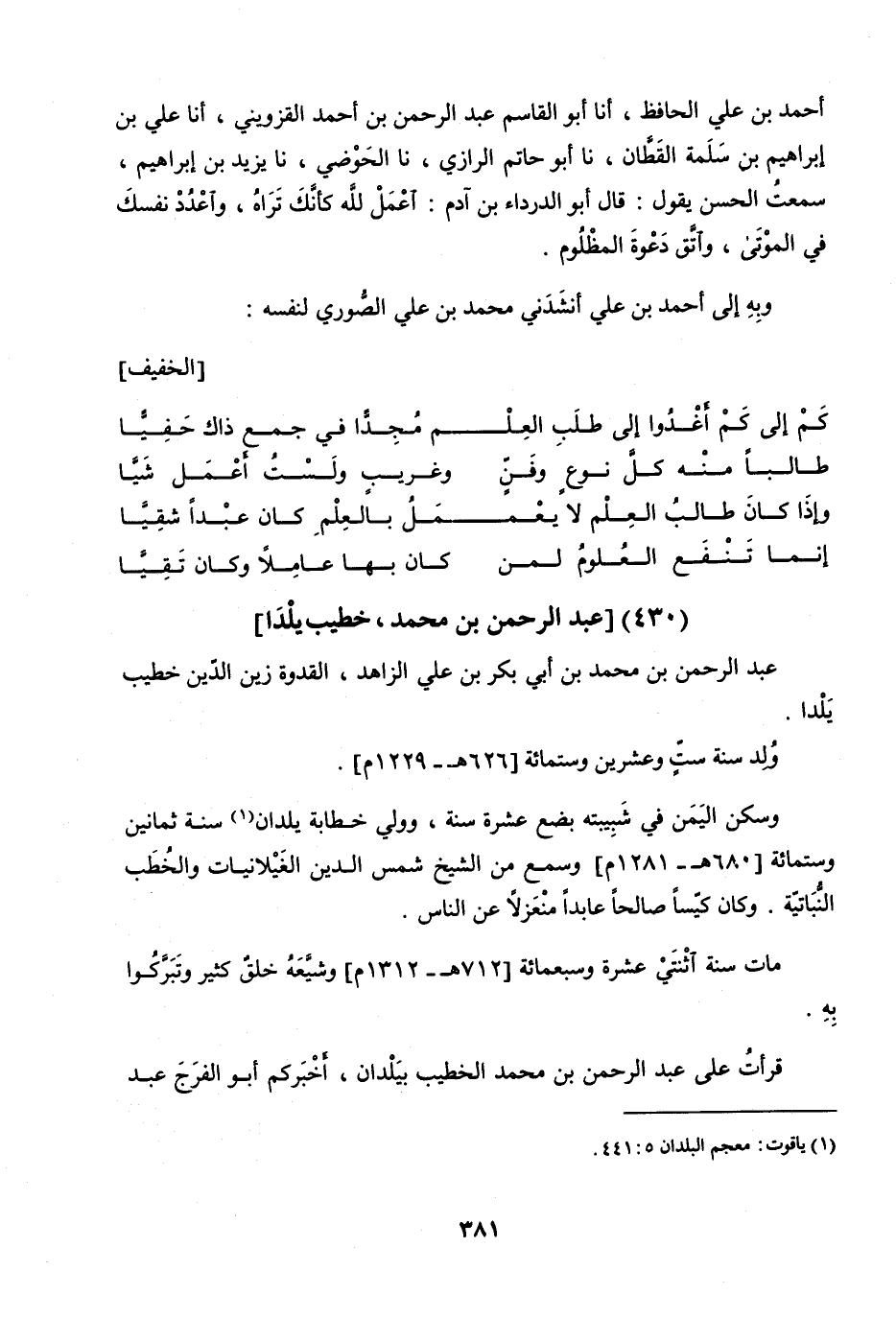 عَبْدُ الرَّحْمَنِ بْنُ مُحَمَّدِ بْنِ أَبِي بَكْرِ بْنِ عَلِيٍّ الزَّاهِدُ الْقُدْوَةُ زَيْنُ الدِّينِ خَطِيبُ يَلْدَا