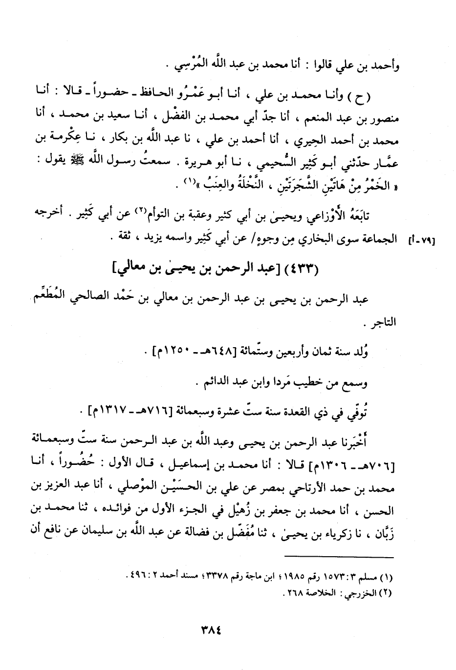 عَبْدُ الرَّحْمَنِ بْنُ يَحْيَى بْنِ عَبْدِ الرَّحْمَنِ بْنِ مَعَالِي بْنِ حَمَدٍ الصَّالِحِيُّ الْمُطْعِمُ التَّاجِرُ