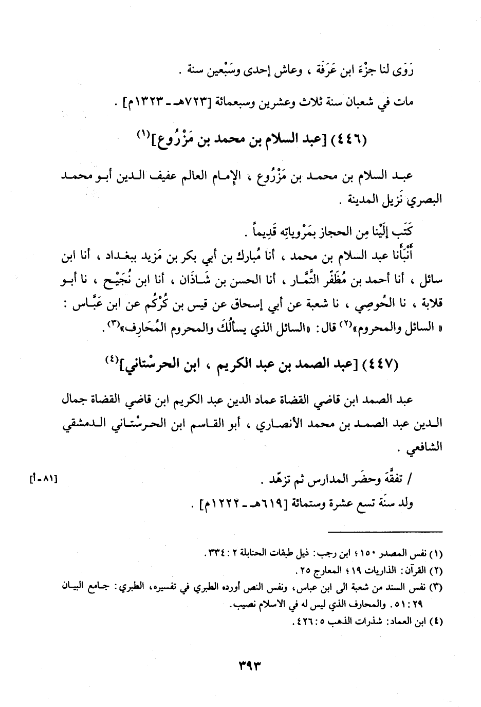 أَنْبَأَنَا عَبْدُ السَّلامِ بْنُ مُحَمَّدٍ، أنا مُبَارَكُ بْنُ أَبِي بَكْرِ بْنِ مَزْيَدَ، بِبَغْدَادَ، أنا ابْنُ سَائِلٍ، أنا أَحْمَدُ بْنُ مُظَفَّرٍ التَّمَّارُ، أنا الْحَسَنُ بْنُ شَاذَانَ، أنا ابْنُ نَجِيحٍ، نا أَبُو قِلابَةَ، نا الْحُوصِيُّ، نا شُعْبَةُ، عَنْ أَبِي إِسْحَاقَ، عَنْ قَيْسِ بْنِ كُرْكُمٍ، عَنِ ابْنِ عَبَّاسٍ: {لِّلسَّائِلِ وَالْمَحْرُومِ} .