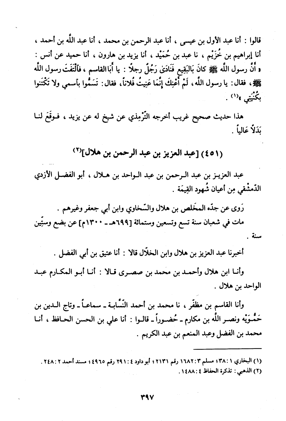 قَالُوا: أنا عَبْدُ الأَوَّلِ بْنُ عِيسَى، أنا عَبْدُ الرَّحْمَنِ بْنُ مُحَمَّدٍ، أنا عَبْدُ اللَّهِ بْنُ أَحْمَدَ، أنا إِبْرَاهِيمُ بْنُ خُزَيْمٍ، نا عَبْدُ بْنُ حُمَيْدٍ، أنا يَزِيدُ بْنُ هَارُونَ، أنا حُمَيْدٌ، عَنْ أَنَسٍ: أَنَّ رَسُولَ اللَّهِ صَلَّى اللَّهُ عَلَيْهِ وَسَلَّمَ كَانَ بِالْبَقِيعِ، فَنَادَى رَجُلٌ رَجُلا: يَا أَبَا الْقَاسِمِ فَالْتَفَتَ رَسُولُ اللَّهِ صَلَّى اللَّهُ عَلَيْهِ وَسَلَّمَ، فَقَالَ: يَا رَسُولَ اللَّهِ، لَمْ أَعْنِكَ إِنَّمَا عَنَيْتُ فُلانًا، فَقَالَ: «تَسَمُّوا بِاسْمِي وَلا تَكْتَنُوا بِكُنْيَتِي» .
