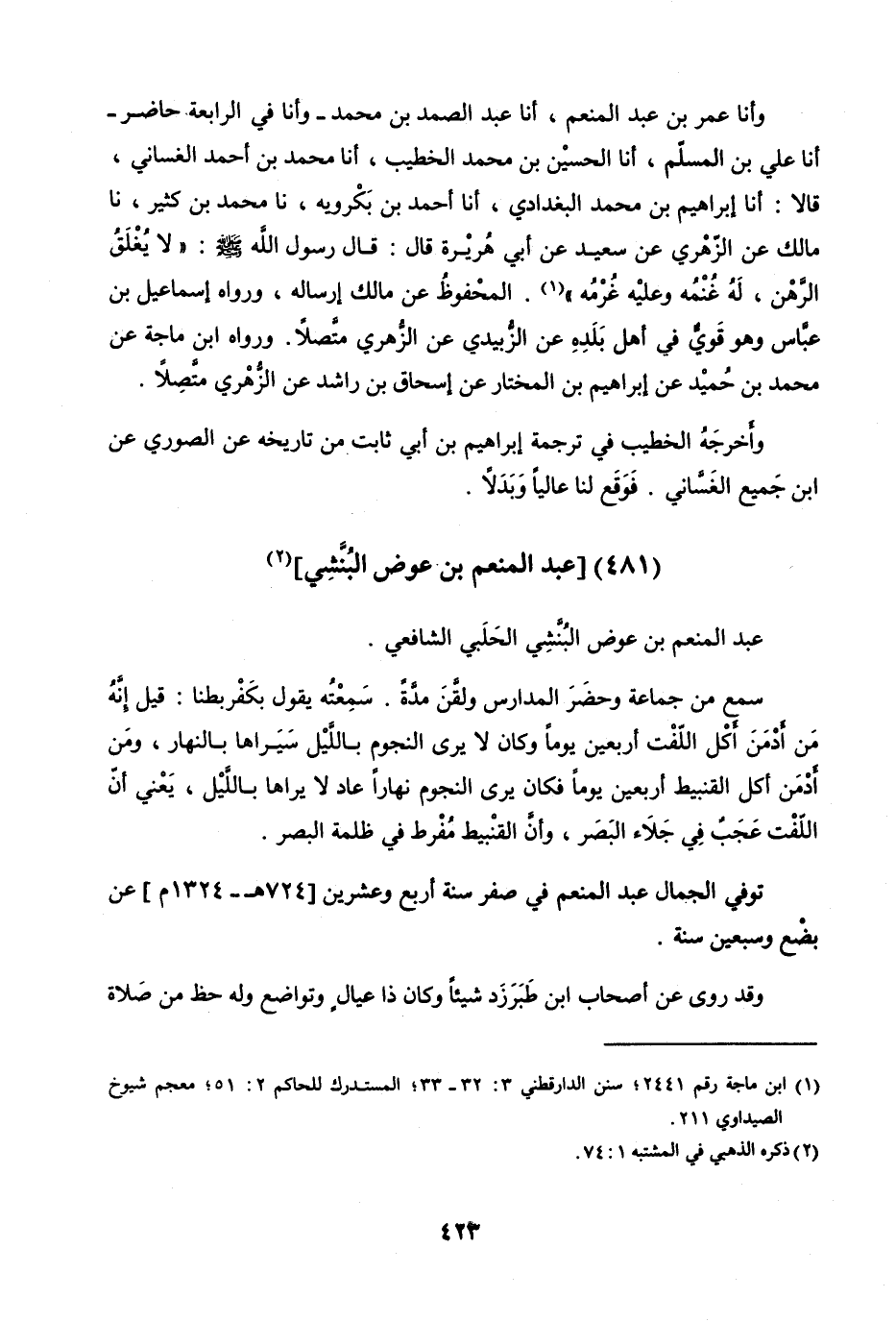 وَأَخْبَرَنَا عُمَرُ بْنُ عَبْدِ الْمُنْعِمِ، أنا عَبْدُ الصَّمَدِ بْنُ مُحَمَّدٍ، وَأَنَا فِي الرَّابِعَةِ حَاضِرٌ، أنا عَلِيُّ بْنُ مُسْلِمٍ، أنا الْحُسَيْنُ بْنُ مُحَمَّدٍ الْخَطِيبُ، أنا مُحَمَّدُ بْنُ أَحْمَدَ الْغَسَّانِيُّ، قَالا: أنا إِبْرَاهِيمُ بْنُ مُحَمَّدٍ الْبَغْدَادِيُّ، أنا أَحْمَدُ بْنُ بَكْرُوَيْهِ، نا مُحَمَّدُ بْنُ كَثِيرٍ، نا مَالِكٌ، عَنِ الزُّهْرِيِّ، عَنْ سَعِيدٍ، عَنْ أَبِي هُرَيْرَةَ، قَالَ: قَالَ رَسُولُ اللَّهِ صَلَّى اللَّهُ عَلَيْهِ وَسَلَّمَ: «لا يُغْلَقُ الرَّهْنُ، لَهُ غُنْمُهُ وَعَلَيْهِ غُرْمُهُ» .