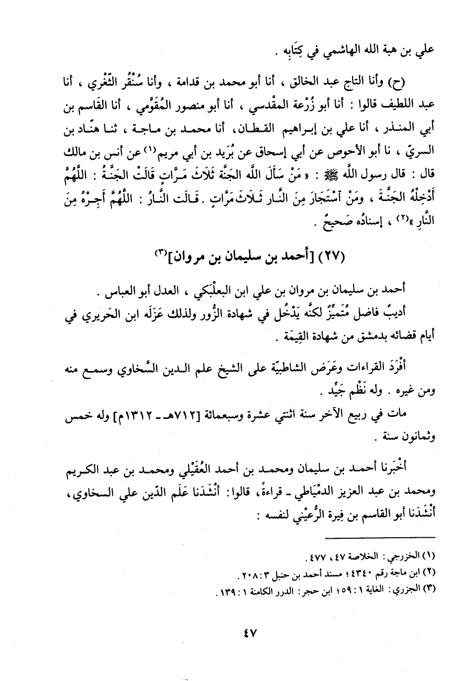 وَأَخْبَرَنَا التَّاجُ عَبْدُ الْخَالِقِ، أنا أَبُو مُحَمَّدِ بْنُ قُدَامَةَ، وأنا سُنْقُرُ الثَّغْرِيُّ، أنا عَبْدُ اللَّطِيفِ، قَالُوا: أنا أَبُو زُرْعَةَ الْمَقْدِسِيُّ، أنا أَبُو مَنْصُورٍ الْمُقَوَّمِيُّ، أنا الْقَاسِمُ بْنُ أَبِي الْمُنْذِرِ، أنا عَلِيُّ بْنُ إِبْرَاهِيمَ الْقَطَّانُ، أنا مُحَمَّدُ بْنُ مَاجَهْ، ثنا هَنَّادُ بْنُ السُّرِّيِّ، نا أَبُو الأَحْوَصِ، عَنْ أَبِي إِسْحَاقَ، عَنْ بُرَيْدِ بْنِ أَبِي مَرْيَمَ، عَنْ أَنَسِ بْنِ مَالِكٍ، قَالَ: قَالَ رَسُولُ اللَّهِ صَلَّى اللَّهُ عَلَيْهِ وَسَلَّمَ: " مَنْ سَأَلَ اللَّهَ الْجَنَّةَ ثَلاثَ مَرَّاتٍ قَالَتِ الْجَنَّةُ: اللَّهُمَّ أَدْخِلْهُ الْجَنَّةَ، وَمَنِ اسْتَجَارَ مِنَ النَّارِ ثَلاثَ مَرَّاتٍ.